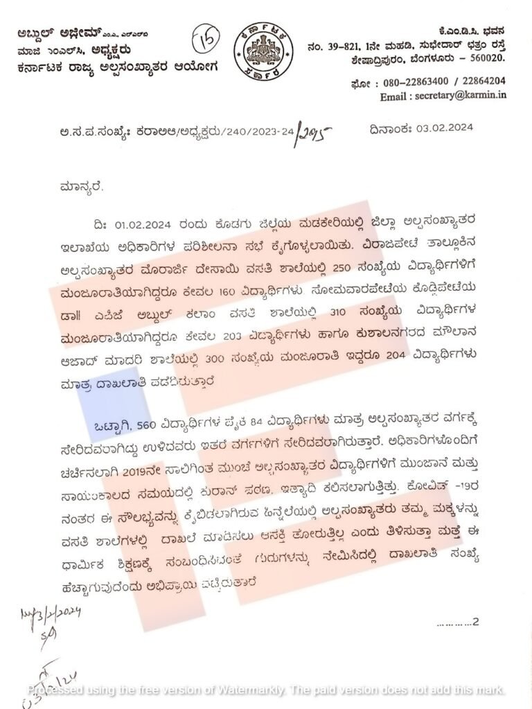ಆಯೋಗದ ಅಧ್ಯಕ್ಷ ಅಬ್ದುಲ್ ಅಜೀಮ್ ಅವರು ಸಚಿವ ಬಿ ಝಡ್ ಜಮೀರ್ ಅಹ್ಮದ್ ಖಾನ್ ಅವರಿಗೆ 2024ರ ಫೆ.3ರಂದೇ ಪತ್ರ ಬರೆದಿದ್ದಾರೆ. ಈ ಪತ್ರದ ಪ್ರತಿಯು ‘ದಿ ಫೈಲ್’ಗೆ ಲಭ್ಯವಾಗಿದೆ.