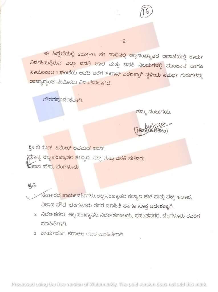 ಈ ಹಿನ್ನೆಲೆಯಲ್ಲಿ 2024-25ನೇ ಸಾಲಿನಲ್ಲಿ ಅಲ್ಪಸಂಖ್ಯಾತರ ಇಲಾಖೆಯಲ್ಲಿ ಕಾರ್ಯನಿರ್ವಹಿಸುತ್ತಿರುವ ಎಲ್ಲಾ ವಸತಿ ಶಾಲೆ, ವಸತಿ ನಿಲಯಗಳಲ್ಲಿ ಮುಂಜಾನೆ ಹಾಗೂ ಸಾಯಂಕಾಲ 1 ಗಂಟೆ ಅವಧಿವರೆಗೆ ಕುರಾನ್ ಪಠಣಕ್ಕಾಗಿ ಸ್ಥಳೀಯ ಸಮರ್ಥ ಗುರುಗಳನ್ನು ರಾಜ್ಯದಾದ್ಯಂತ ನೇಮಿಸಬೇಕು ಎಂದು ಪತ್ರದಲ್ಲಿ ಅಜೀಮ್ ಅವರು ಕೋರಿರುವುದು ಗೊತ್ತಾಗಿದೆ.