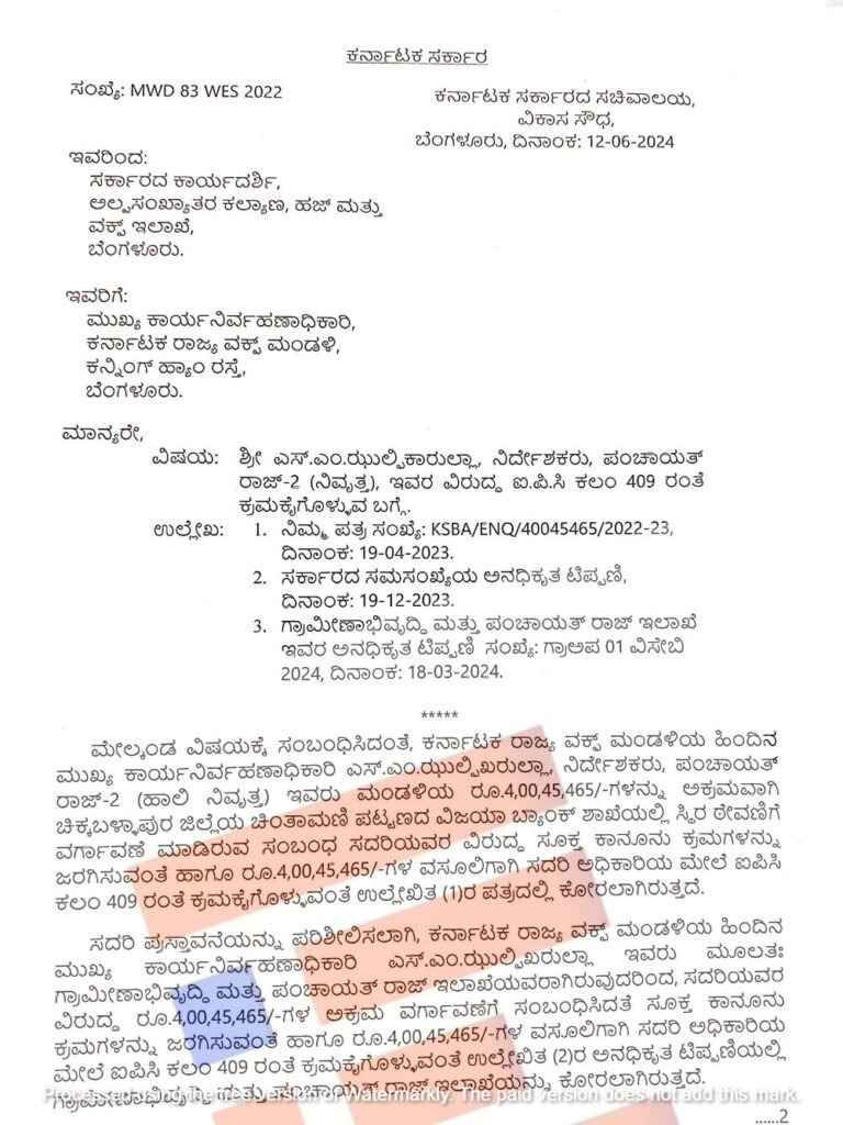 ಮಂಡಳಿಯ ಹಿಂದಿನ ಮುಖ್ಯ ಕಾರ್ಯನಿರ್ವಾಹಕ ಅಧಿಕಾರಿ ಎಸ್ ಎಂ ಝುಲ್ಪಿಕಾರುಲ್ಲಾ ಅವರು ಮಂಡಳಿಗೆ ಸೇರಿದ್ದ 4,00,45,465 ರು.ಗಳನ್ನು ಅಕ್ರಮವಾಗಿ ಚಿಂತಾಮಣಿಯಲ್ಲಿರುವ ವಿಜಯಾ ಬ್ಯಾಂಕ್ ಶಾಖೆಯಲ್ಲಿನ ಸ್ಥಿರ ಠೇವಣಿಗೆ ವರ್ಗಾವಣೆ ಮಾಡಿದ್ದರು. ಈ ಸಂಬಂಧ ಸೂಕ್ತ ಕಾನೂನು ಕ್ರಮ ಕ್ರಮಕೈಗೊಳ್ಳುವುದು ಮತ್ತು ಈಹಣವನ್ನು ವಸೂಲು ಮಾಡಬೇಕು ಎಂದು ಸರ್ಕಾರದ ಕಾರ್ಯದರ್ಶಿಯು 2023ರ ಏಪ್ರಿಲ್ 19ರಂದೇ ಪತ್ರ ಬರೆಯಲಾಗಿತ್ತು ಎಂಬುದು ಪತ್ರದಿಂದ ಗೊತ್ತಾಗಿದೆ.