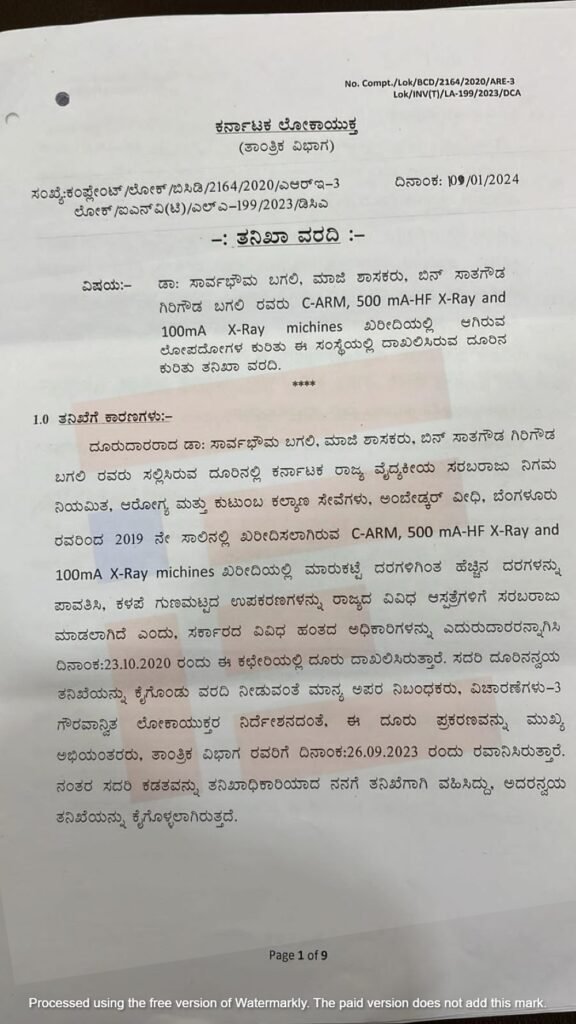 2019ನೇ ಸಾಲಿನಲ್ಲಿ ಕರ್ನಾಟಕ ವೈದ್ಯಕೀಯ ಸರಬರಾಜು ನಿಗಮವು ಎಕ್ಸ್‌ ರೇ ಯಂತ್ರೋಪಕರಣಗಳ ಖರೀದಿಯಲ್ಲಿ ಹಲವು ಲೋಪ ಮತ್ತು ಅಕ್ರಮಗಳನ್ನು ನಡೆಸಿದೆ ಎಂದು ಬಿಜೆಪಿ ಮಾಜಿ ಶಾಸಕ ಡಾ ಸಾರ್ವಭೌಮ ಬಗಲಿ ಅವರು ಲೋಕಾಯುಕ್ತಕ್ಕೆ 2020ರಲ್ಲಿ ದೂರು ಸಲ್ಲಿಸಿದ್ದರು.
