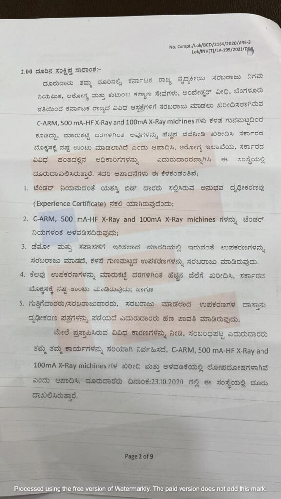 ಟೆಂಡರ್‍‌ ನಿಯಮದಂತೆ ಯಶಸ್ವಿ ಬಿಡ್‌ದಾರರು ಸಲ್ಲಿಸಿರುವ ಅನುಭವ ದೃಢೀಕರಣ ಪತ್ರವು ನಕಲಿಯಾಗಿದೆ. C-ARM, 500, mA-HF X-Ray and 100ma X-RAY ಗಳನ್ನು ಟೆಂಡರ್‍‌ ನಿಯಮಗಳಂತೆ ಅಳವಡಿಸಿಲ್ಲ. ಡೆಮೋ ಮತ್ತು ತಪಾಸಣೆಗೆ ಇರಿಸಲಾದ ಮಾದರಿಯಲ್ಲಿ ಇರುವಂತೆ ಉಪಕರಣಗಳನ್ನು ಸರಬರಾಜು ಮಾಡದೇ ಕಳಪೆ ಗುಣಮಟ್ಟದ ಉಪಕರಣಗಳನ್ನು ಸರಬರಾಜು ಮಾಡಲಾಗಿದೆ ಎಂದು ದೂರಿದ್ದರು.
