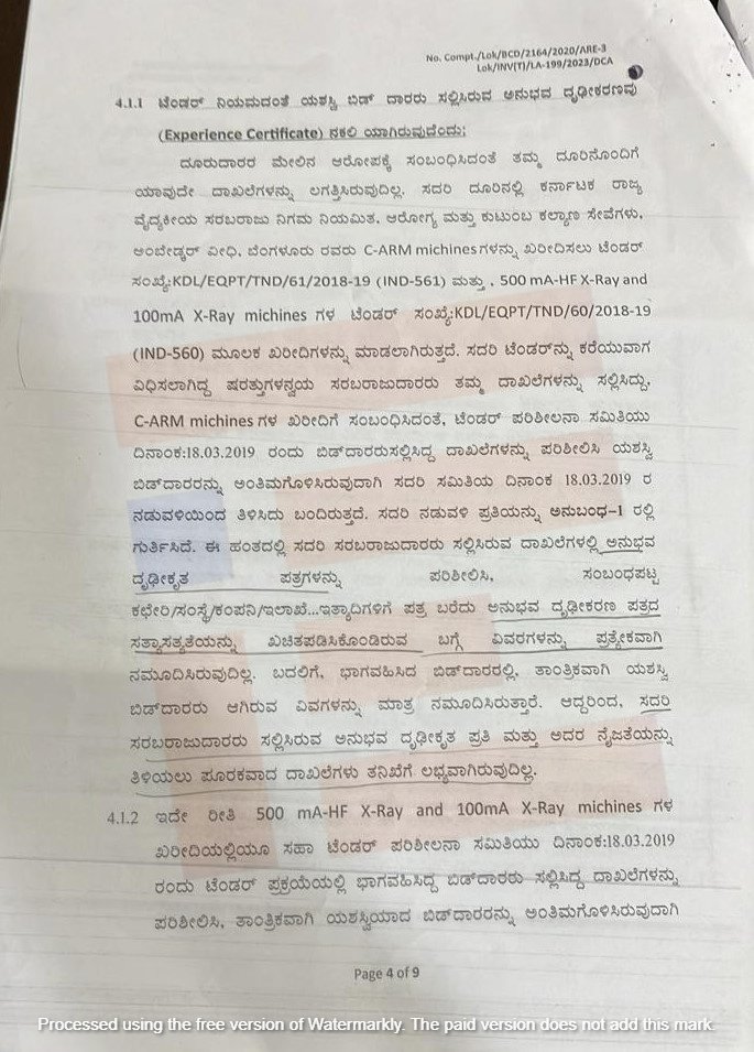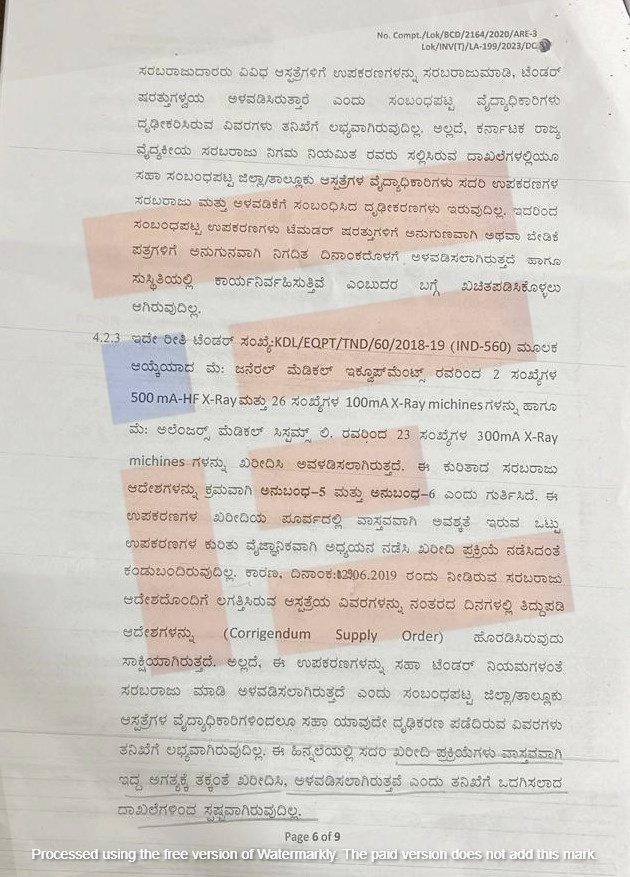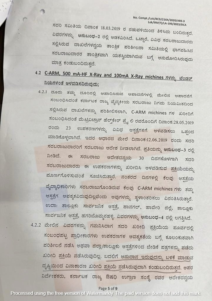 500, mA-HF X-Rಆ್ಯ and 100ma X-RAY ಯಂತ್ರಗಳ ಖರೀದಿಯಲ್ಲಿಯೂ ಸಹಾ ಟೆಂಡರ್‍‌ ಪರಿಶೀಲನಾ ಸಮಿತಿಯು 2019ರ ಮಾರ್ಚ್‌ 18ರಂದು ಟೆಂಡರ್‍‌ ಪ್ರಕ್ರಿಯೆಯಲ್ಲಿ ಭಾಗವಹಿಸಿದ್ದ ಬಿಡ್‌ದಾರರು ಸಲ್ಲಿಸಿದ್ದ ದಾಖಲೆಗಳನ್ನು ಪರಿಶೀಲಿಲಸಿ ತಾಂತ್ರಿಕವಾಗಿ ಯಶಸ್ವಿಯಾದ ಬಿಡ್‌ದಾರರನ್ನು ಅಂತಿಮಗೊಳಿಸಿತ್ತು. ಒಟ್ಟಾರೆ ವಿವಿಧ ಸರಬರಾಜುದಾರರು ಸಲ್ಲಿಸಿರುವ ದಾಖಲೆಗಳ ಅನ್ವಯ ತಾಂತ್ರಿಕ ಪರಿಶೀಲನಾ ಸಮಿತಿಯಲ್ಲಿ ಭಾಗವಹಿಸಿದ ಸರಬರಾಜುದಾರರ ತಾಂತ್ರಿಕವಾಗಿ ಯಶಸ್ವಿಯಾಗಿರುವ ಬಗ್ಗೆ ಮಾತ್ರ ಅನುಮೋದಿಸಿತ್ತು ಎಂಬುದು ತನಿಖಾ ವರದಿಯಿಂದ ತಿಳಿದು ಬಂದಿದೆ.