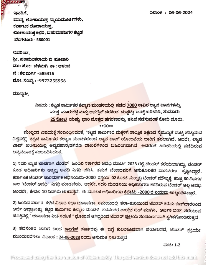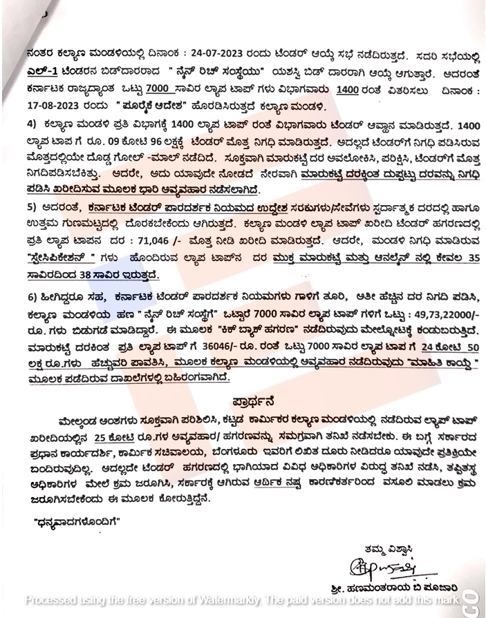 ಲ್ಯಾಪ್‌ಟಾಪ್‌ ಖರೀದಿಗಾಗಿ ಹಿಂದಿನ ಸರ್ಕಾರವು 2023ರಲ್ಲಿ ಟೆಂಡರ್ ಕರೆದಿತ್ತು. ಟೆಂಡರ್‍‌ ಪ್ರಕ್ರಿಯೆಯನ್ನು ಅತ್ಯಲ್ಪ ಅವಧಿಯನ್ನು ನಿಗದಿಪಡಿಸಿತ್ತು. ತಮಗೆ ಬೇಕಾದವರಿಗೆ ಅನುಕೂಲಕರ ವಾತಾವರಣ ಸೃಷ್ಟಿಸಿದ್ದಾರೆ. ಕರ್ನಾಟಕ ಪಾರದರ್ಶಕ ಅಧಿನಿಯಮ ಅನ್ವಯ 02 ಕೋಟಿ ರು ಮೇಲ್ಪಟ್ಟ ಟೆಂಡರ್‍‌ ಮೌಲ್ಯಕ್ಕೆ ಕನಿಷ್ಠ 60 ದಿನಗಳ ಕಾಲ ಟೆಂಡರ್‍‌ ಅವಧಿ ನಿಗದಿಪಡಿಸಬೇಕು ಆದರೆ ಮಂಡಳಿ ಅಧಿಕಾರಿಗಳು ಕರೆದಿದ್ದ ಟೆಂಡರ್‍‌ ಅವಧಿಯು ಅಲ್ಪ ಅವಧಿ ಅಂದರೇ 10 ದಿನಗಳ ಆಗಿದೆ. ಈ ಮೂಲಕ ಕೆಟಿಪಿಪಿ ನಿಯಮ 2000ನ್ನು ಉಲ್ಲಂಘಿಸಿದ್ದಾರೆ ಎಂದು ಹನುಮಂತರಾಯ ಅವರು ದೂರಿನಲ್ಲಿ ವಿವರಿಸಿರುವುದು ಗೊತ್ತಾಗಿದೆ.