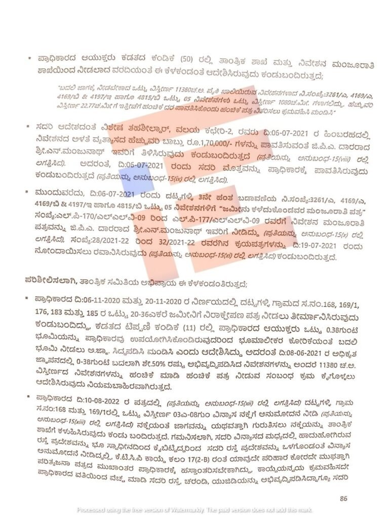 0-38 ಗುಂಟೆ ಬದಲಾಗಿ ಶೇ 50ರಷ್ಟು ಅಭಿವೃದ್ಧಿ ಪಡಿಸಿದ್ದ 11380 ಚದರ ಅಡಿ ವಿಸ್ತೀರ್ಣದ ನಿವೇಶನಗಳನ್ನು ಅರ್ಜಿದಾರರೊಬ್ಬರಿಗೆ ಹಂಚಿಕೆ ಮಾಡಿರುವುದನ್ನು ತಾಂತ್ರಿಕ ಸಮಿತಿಯು ದೃಢಪಡಿಸಿದೆ.