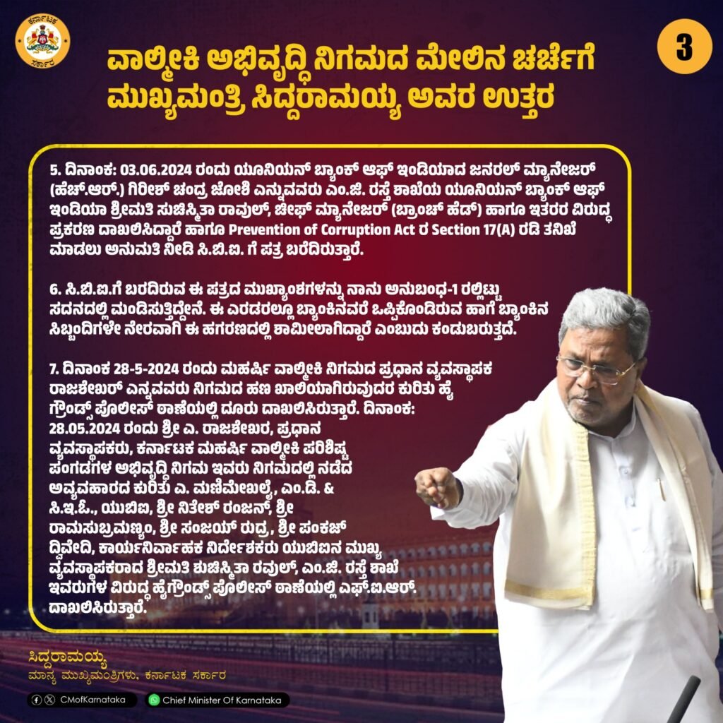 ಬೆಂಗಳೂರು; ಕರ್ನಾಟಕ ಮಹರ್ಷಿ ವಾಲ್ಮೀಕಿ ಅಭಿವೃದ್ದಿ ನಿಗಮದಲ್ಲಿ ನಡೆದಿರುವ ಬಹು ಕೋಟಿ ಹಗರಣವನ್ನೇ ಪ್ರಬಲ ಅಸ್ತ್ರವನ್ನಾಗಿಸಿಕೊಂಡಿರುವ ಪ್ರತಿಪಕ್ಷಗಳು, ಉಭಯ ಸದನಗಳಲ್ಲಿ ಸರ್ಕಾರದ ವಿರುದ್ಧ ಪ್ರತಿಭಟಿಸುತ್ತಿರುವ ಹೊತ್ತಿನಲ್ಲೇ ಇದೀಗ ಮುಖ್ಯಮಂತ್ರಿ ಸಿದ್ದರಾಮಯ್ಯ ಮತ್ತು ಇಡೀ ಸರ್ಕಾರವೇ ಈ ಹಗರಣವನ್ನು ನೇರವಾಗಿ ಯೂನಿಯನ್ ಬ್ಯಾಂಕ್ ಆಫ್ ಇಂಡಿಯಾದ ತಲೆಗೆ ಕಟ್ಟಿದೆ.