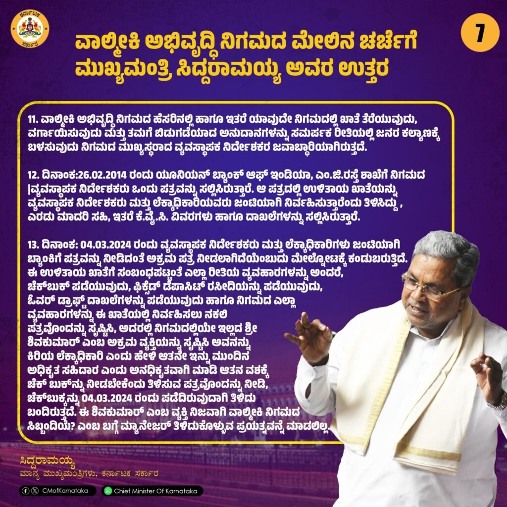 ಮಹರ್ಷಿ ವಾಲ್ಮೀಕಿ ಅಭಿವೃದ್ದಿ ನಿಗಮದಲ್ಲಿ 89.63 ಕೋಟಿ ರು.ಗಳನ್ನು ಅಕ್ರಮವಾಗಿ ಹೈದರಾಬಾದ್ನ ಆರ್ ಬಿ ಎಲ್ ಬ್ಯಾಂಕ್ಗೆ ವರ್ಗಾವಣೆ ಆಗಿರುತ್ತದೆ. ( ಈ 89.63 ಕೋಟಿ ರು.ಗಳಲ್ಲಿ 5 ಕೋಟಿ ವಾಪಸ್ ಬಂದಿರುತ್ತದೆ. 89.63 ಕೋಟಿ ರು.ಗಳಲ್ಲಿ 45,02,98,000 ರುಗ.ಳು ಉಳಿತಾಯ ಖಾತೆಯಿಂದ ವರ್ಗಾವಣೆ ಆಗಿರುತ್ತವೆ. ಇನ್ನುಳಿದ 44.60 ಕೊಟಿ ರು.ಗಳು ನಿಮಗವು ಇಟ್ಟಿದ್ದ ಫಿಕ್ಸೆಡ್ ಡಿಪಾಸಿಟ್ ಮೇಲೆ ಓವರ್ ಡ್ರಾಫ್ಟ್ ತೆಗೆದಿದ್ದಾರೆ ಎಂದು ಸ್ಪಷ್ಟನೆ ನೀಡಿದ್ದಾರೆ.