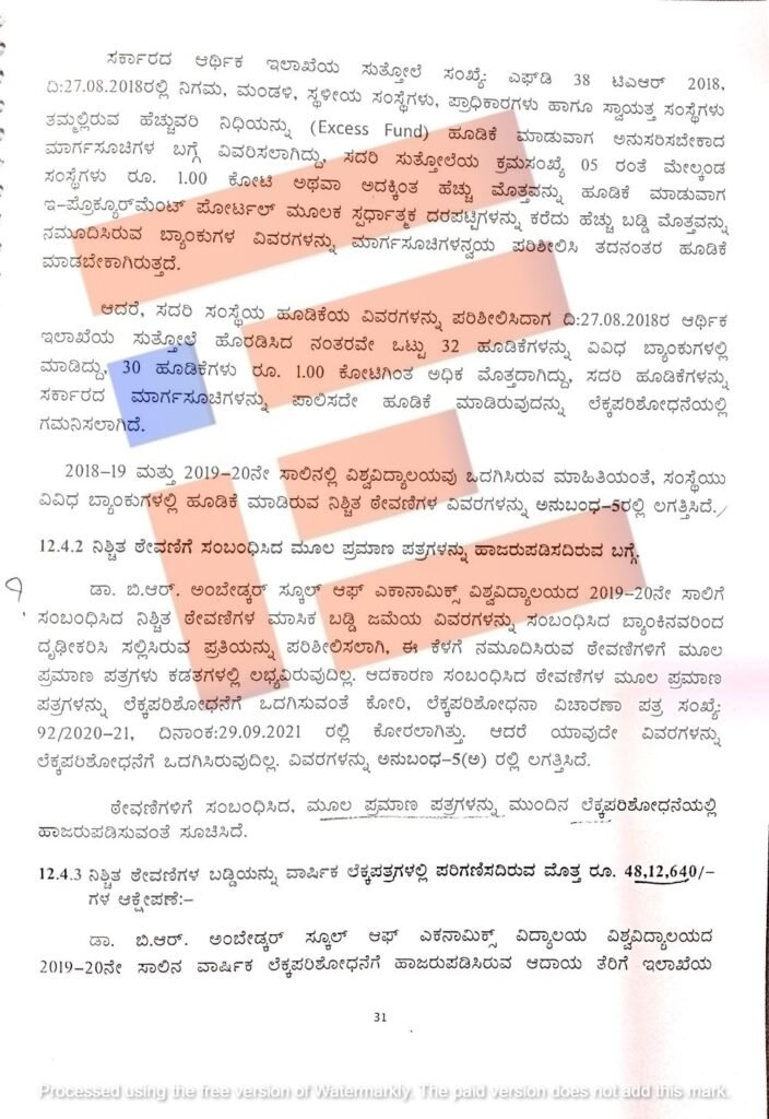 ಆದರೆ ಡಾ ಬಿ ಆರ್ ಅಂಬೇಡ್ಕರ್ ಸ್ಕೂಲ್ ಆಫ್ ಎಕಾನಾಮಿಕ್ಸ್ ಸಂಸ್ಥೆಯು ಸರ್ಕಾರದ ಮಾರ್ಗಸೂಚಿಗಳನ್ನು ಪಾಲಿಸದೇ 1 ಕೋಟಿಗೂ ಹೆಚ್ಚು ಮೊತ್ತದಷ್ಟು 30 ಹೂಡಿಕೆಗಳನ್ನು ವಿವಿಧ ಬ್ಯಾಂಕ್ಗಳಲ್ಲಿ ಮಾಡಿತ್ತು ಎಂಬುದು ಲೆಕ್ಕ ಪರಿಶೋಧನೆ ವರದಿಯಿಂದ ತಿಳಿದು ಬಂದಿದೆ.