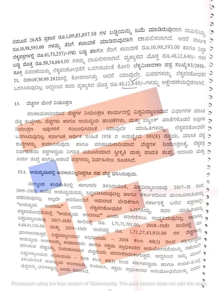 2018-18ನೇ ಸಾಲಿನಲ್ಲಿ 1,71,71,701 ರು., 2018-19ನೇ ಸಾಲಿನಲ್ಲಿ 6,80,41,126 ರು ಮತ್ತು 2019-20ನೇ ಸಾಲಿನಲ್ಲಿ 172, 27,43,931 ರು. ವೆಚ್ಚ ಭರಿಸಿತ್ತು. ವಿಶ್ವವಿದ್ಯಾಲಯದ ಅಧಿನಿಯಮ 2018 ಕಲಂ 40(1)ರಿಂದ 40(4) ಅನ್ವಯ ಆಯವ್ಯಯ ಅಂದಾಜನ್ನು ತಯಾರಿಸದೇ ಹಾಗೂ ಸಕ್ಷಮ ಪ್ರಾಧಿಕಾರದ ಅನುಮೋದನೆಯನ್ನೇ ಪಡೆಯದೇ ಭರಿಸಿರುವ ವೆಚ್ಚವನ್ನು ನಿಯಮಬಾಹಿರ ವೆಚ್ಚವೆಂದು ಲೆಕ್ಕ ಪರಿಶೋಧಕರು ಪರಿಗಣಿಸಿರುವುದು ತಿಳಿದು ಬಂದಿದೆ.