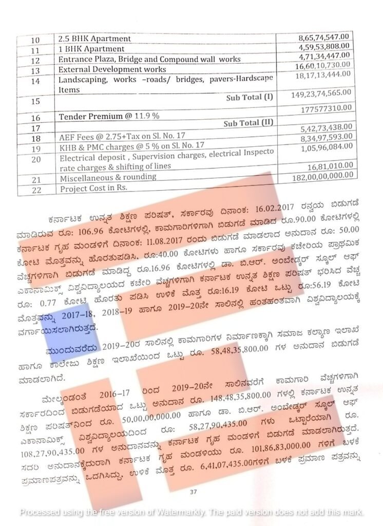 ಕಟ್ಟಡ ಕಾಮಗಾರಿಗಳಿಗಾಗಿ 2016-17ರಿಂದ 2019-20ನೇ ಸಾಲಿನವರೆಗೆ ಕಾಮಗಾರಿ ವೆಚ್ಚಗಳಿಗಾಗಿ ಒಟ್ಟು 148.48 ಕೋಟಿ ರು. ಅನುದಾನ ನಿಗದಿಯಾಗಿತ್ತು. ಈ ಪೈಕಿ ಕರ್ನಾಟಕ ಉನ್ನತ ಶಿಕ್ಷಣ ಪರಿಷತ್ನಿಂದ 50.00 ಕೋಟಿ, ಡಾ ಬಿ ಆರ್ ಅಂಬೇಡ್ಕರ್ ಸ್ಕೂಲ್ ಆಫ್ ಎಕಾನಾಮಿಕ್ಸ್ ವಿಶ್ವವಿದ್ಯಾಲಯದಿಂದ 58.27 ಕೋಟಿ ರು., ಒಟ್ಟಾರೆ 108.27 ಕೋಟಿ ರು. ಕರ್ನಾಟಕ ಗೃಹ ಮಂಡಳಿಗೆ ಬಿಡುಗಡೆಯಾಗಿತ್ತು.