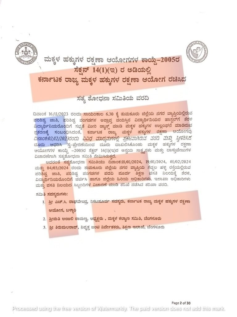 ತುಮಕೂರಿನ ಹಿಂದಿನ ಜಿಲ್ಲಾಧಿಕಾರಿ ಶ್ರೀನಿವಾಸ್ ಸೇರಿದಂತೆ ಇನ್ನಿತರೆ ಅಧಿಕಾರಿಗಳು ಭಾಗವಹಿಸಿದ್ದ ಈ ಪ್ರಕರಣದಲ್ಲಿ ಮಕ್ಕಳ ಹಕ್ಕು, ಘನತೆ, ಗುರುತು, ಸ್ವಾತಂತ್ರ್ಯ, ಗೌಪ್ಯತೆ, ನಂಬಿಕೆ ಹಾಗೂ ಸ್ವಾಭಿಮಾನಕ್ಕೆ ಧಕ್ಕೆ ಆಗಿರುವುದನ್ನು ತ್ರಿಸದಸ್ಯ ಸಮಿತಿಯ ಸತ್ಯಶೋಧನಾ ವರದಿಯು ಖಚಿತಪಡಿಸಿದೆ.