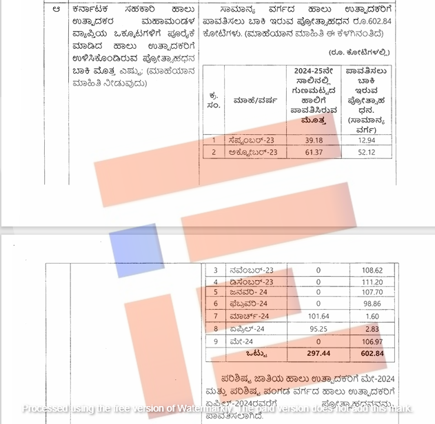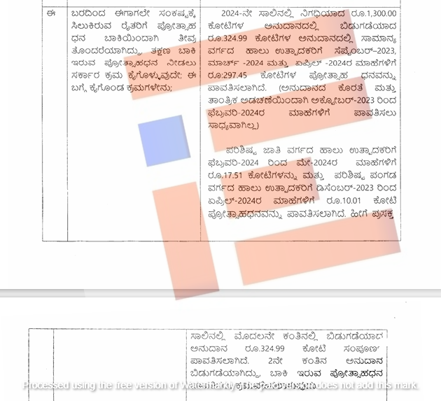 ಹಾಲು ಉತ್ಪಾದಕರಿಗೆ ಪ್ರೋತ್ಸಾಹ ಧನ ಪಾವತಿಸಲು 602.84 ಕೋಟಿ ರು ಪಾವತಿಗೆ ಬಾಕಿ ಇರಲು ಅನುದಾನ ಕೊರತೆಯೇ ಕಾರಣ ಎಂಬುದನ್ನು ಸರ್ಕಾರವು ಲಿಖಿತ ಉತ್ತರದಲ್ಲೇ ಒಪ್ಪಿಕೊಂಡಿದೆ.