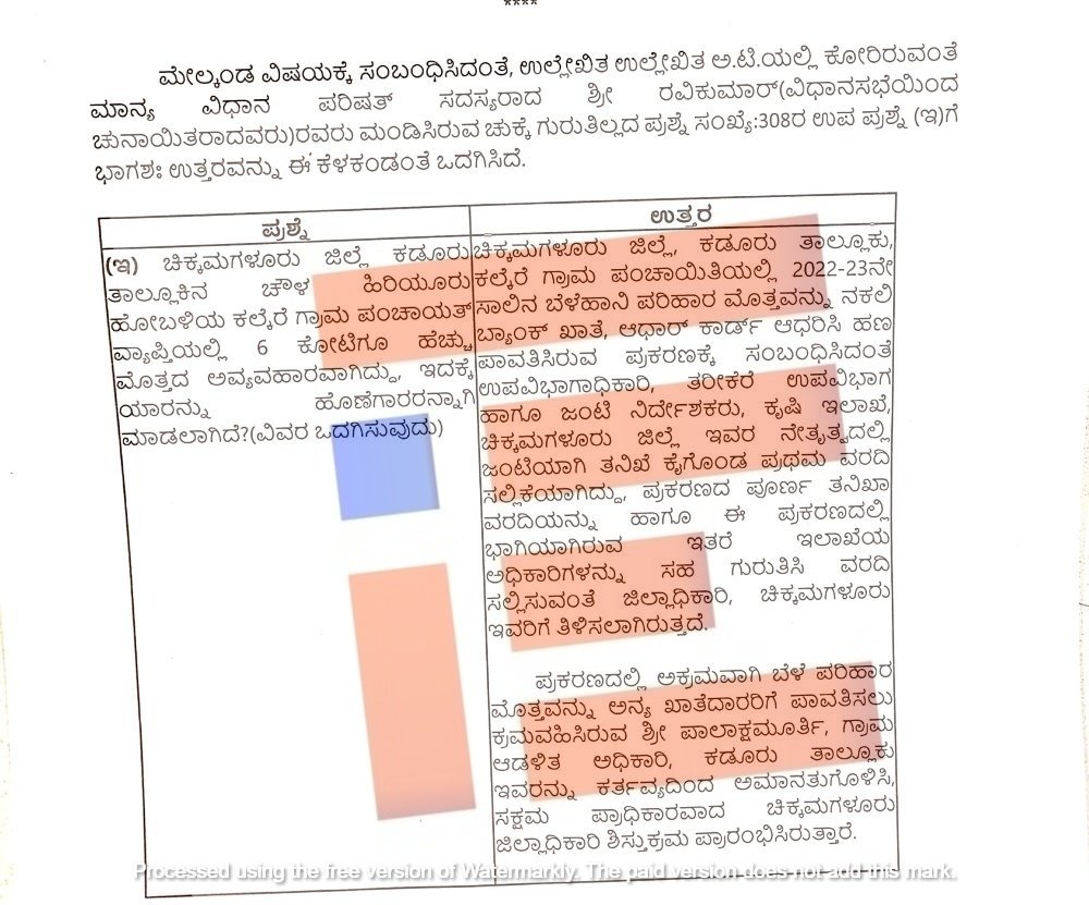 ಚಿಕ್ಕಮಗಳೂರು ಜಿಲ್ಲೆ ಕಡೂರು ತಾಲೂಕಿನ ಕಲ್ಕೆರೆ ಗ್ರಾಮ ಪಂಚಾಯ್ತಿಯಲ್ಲಿ 2022-23ನೇ ಸಾಲಿನ ಬೆಳೆ ಹಾನಿ ಪರಿಹಾರವನ್ನು ನಕಲಿ ಬ್ಯಾಂಕ್ ಖಾತೆ, ಆಧಾರ್ ಕಾರ್ಡ್ ಆಧರಿಸಿ ಹಣ ಪಾವತಿಸಲಾಗಿದೆ. ಈ ಪ್ರಕರಣಕ್ಕೆ ಸಂಬಂಧಿಸಿದಂತೆ ತರೀಕೆರೆ ಉಪ ವಿಭಾಗದ ಉಪ ವಿಭಾಗಾಧಿಕಾರಿ ಹಾಗೂ ಕೃಷಿ ಇಲಾಖೆಯ ಜಂಟಿ ನಿರ್ದೇಶಕರ ನೇತೃತ್ವದಲ್ಲಿ ಜಂಟಿ ತನಿಖೆ ನಡೆದಿತ್ತು.