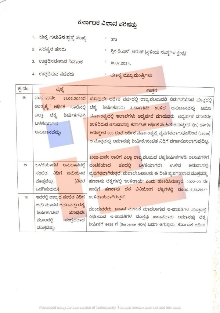 2022-23ನೇ 31.03.2023ರ ಅಂತ್ಯಕ್ಕೆ ಆರ್ಥಿಕ ಸಾಲಿನಲ್ಲಿ ಎಲ್ಲಾ ಲೆಕ್ಕ ಶೀರ್ಷಿಕೆಗಳಲ್ಲಿ ಬಳಕೆಯಾಗದ ಅನುದಾವನೆಷ್ಟು, ಬಳಕೆಯಾಗದ ಅನುದಾನದಲ್ಲಿ ಸಂಚಿತ ನಿಧಿಗೆ ಜಮೆಯಾದ ಮೊತ್ತವೆಷ್ಟು, ಇದರಲ್ಲಿ ರಾಜ್ಯದ ಸಂಚಿತ ನಿಧಿಗೆ ಜಮೆ ಮಾಡದೇ ಅಮಾನತು ಲೆಕ್ಕ ಶೀರ್ಷಿಕೆ ಮಾಡದೇ ಅಮಾನತು ಲೆಕ್ಕ ಶೀರ್ಷಿಕೆ/ಬೇರೆ ಯಾವುದೇ ಮೂಲದಲ್ಲಿ ಸಂಗ್ರಹವಾದ ಮೊತ್ತವೆಷ್ಟು, ಇದರಲ್ಲಿ ವಿಧಾನಮಂಡಲದ ಅನುಮೋದನೆ ಪಡೆಯದೇ ಬಳಕೆ ಮಾಡಿದ ಮೊತ್ತವೆಷ್ಟು ಎಂದು ಡಿ ಎಸ್ ಅರುಣ್ ಅವರು ಪ್ರಶ್ನೆ ಕೇಳಿದ್ದರು.