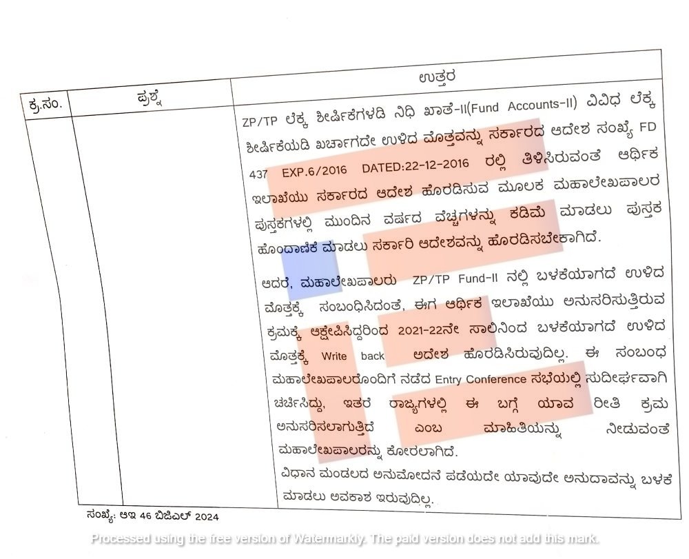 ಆದರೆ ಮಹಾಲೇಖಪಾಲರು ಜಿಪಂ ತಾಪಂ ನಿಧಿ 2ನಲ್ಲಿ ಬಳಕೆಯಾಗದೇ ಉಳಿದ ಮೊತ್ತಕ್ಕೆ ಸಂಬಂಧಿಸಿದಂತೆ ಈಗ ಆರ್ಥಿಕ ಇಲಾಖೆಯು ಅನುಸರಿಸುತ್ತಿರುವ ಕ್ರಮಕ್ಕೆ ಆಕ್ಷೇಪಿಸಿದ್ದರಿಂದ 2021-22ನೇ ಸಾಲಿನಿಂದ ಬಳಕೆಯಾಗದೇ ಉಳಿದ ಮೊತ್ತಕ್ಕೆ write back ಆದೇಶ ಹೊರಡಿಸಿರುವುದಿಲ್ಲ. ಈ ಸಂಬಂಧ ಮಹಾಲೇಖಪಾಲರೊಂದಿಗೆ ನಡೆದ ENTRY CONFERENCE ಸಭೆಯಲ್ಲಿ ಸುದೀರ್ಘವಾಗಿ ಚರ್ಚಿಸಿದ್ದು ಇತರೆ ರಾಜ್ಯಗಳಲ್ಲಿ ಈ ಬಗ್ಗೆ ಯಾವ ರೀತಿ ಕ್ರಮ ಅನುಸರಿಸಲಾಗುತ್ತಿದೆ ಎಂಬ ಮಾಹಿತಿಯನ್ನು ನೀಡುವಂತೆ ಮಹಾಲೇಖಪಾಲರನ್ನು ಕೋರಲಾಗಿದೆ ಎಂಬ ಮಾಹಿತಿಯನ್ನು ಒದಗಿಸಿದೆ.