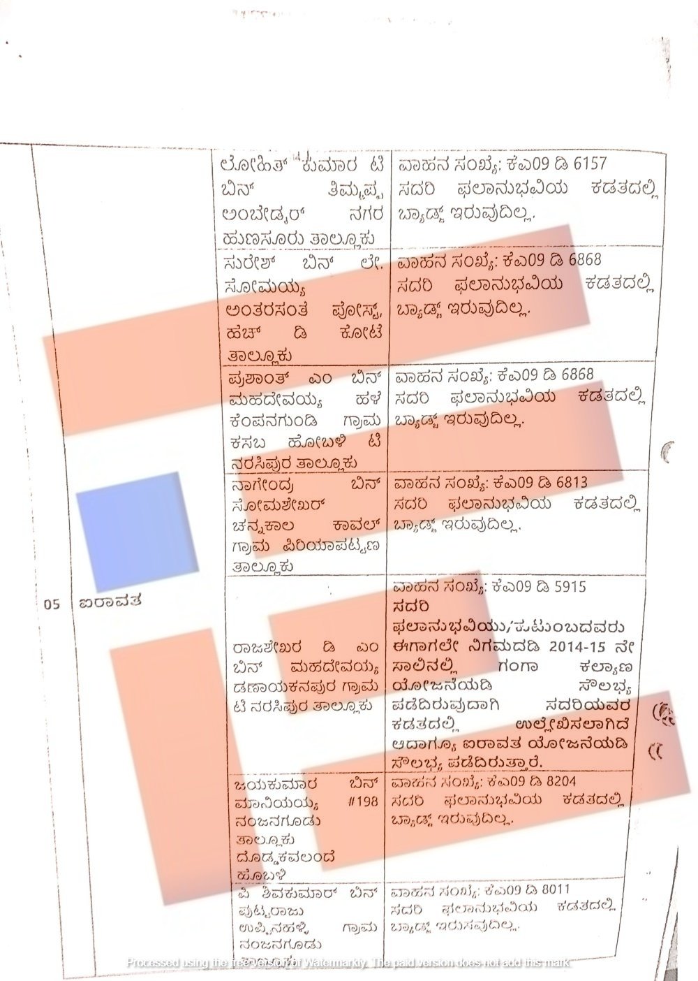 ಟಿ ನರಸೀಪುರ ತಾಲೂಕಿನ ಡಣಾಯಕಪುರದ ರಾಜಶೇಖರ ಡಿ ಎಂ (ವಾಹನ ಸಂಖ್ಯೆ; ಕೆಎ 09 ಡಿ 5915) ಎಂಬುವರು 2014-15ನೇ ಸಾಲಿನಲ್ಲಿಯೇ ಗಂಗಾ ಕಲ್ಯಾಣ ಯೋಜನೆಯಡಿ ಸಹಾಯಧನ ಸೌಲಭ್ಯ ಪಡೆದಿದ್ದರು. ಆದರೂ ಪುನಃ ಐರಾವತ ಯೋಜನೆಯಡಿಯಲ್ಲಿಯೂ ಸೌಲಭ್ಯ ಪಡೆದಿರುವುದನ್ನು ಜಾಗೃತ ಕೋಶದ ಅಧಿಕಾರಿಗಳು ಪತ್ತೆ ಹಚ್ಚಿದ್ದಾರೆ.
