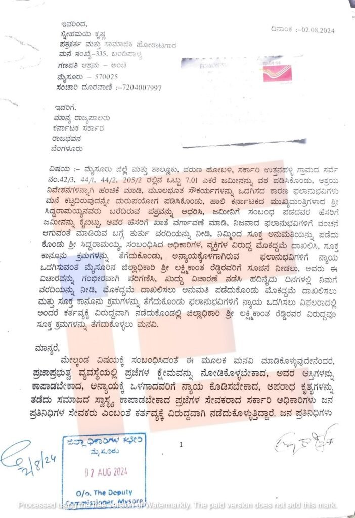 ಈ ಪ್ರಕರಣದ ಕುರಿತು ದಾಖಲೆಗಳ ಸಮೇತ ಮೈಸೂರಿನ ಸ್ನೇಹಮಯಿ ಕೃಷ್ಣ ಅವರು ರಾಜ್ಯಪಾಲರಿಗೆ 12 ಪುಟಗಳ ದೂರು ಸಲ್ಲಿಸಿದ್ದಾರೆ. ಈ ದೂರಿನ ಪ್ರತಿ ಮತ್ತು ಅದರೊಂದಿಗೆ ಲಗತ್ತಿಸಿರುವ ದಾಖಲೆಗಳು ‘ದಿ ಫೈಲ್’ಗೆ ಲಭ್ಯವಾಗಿವೆ.