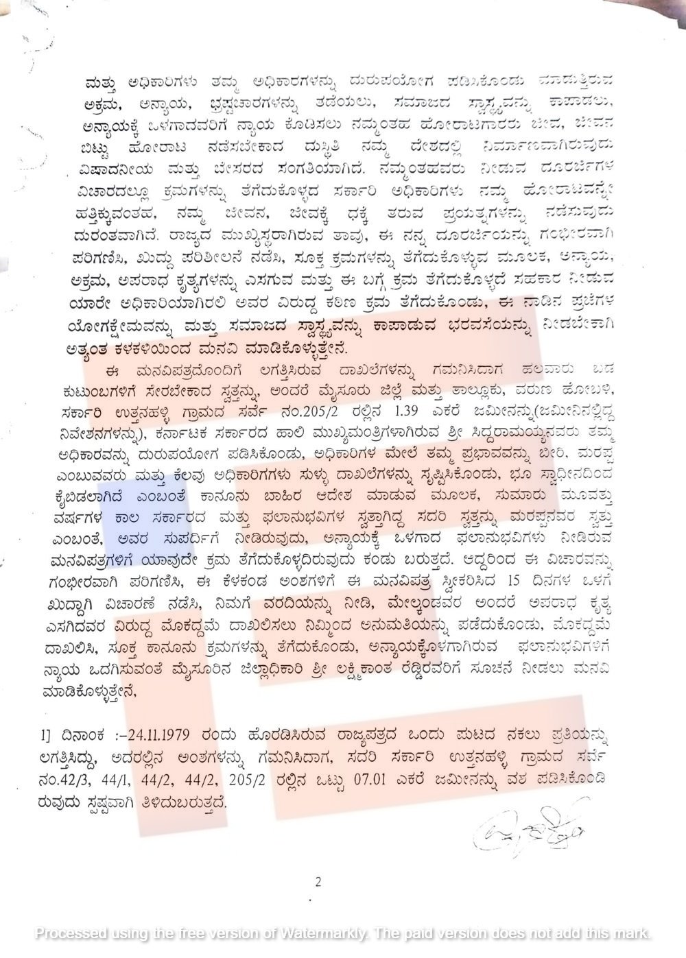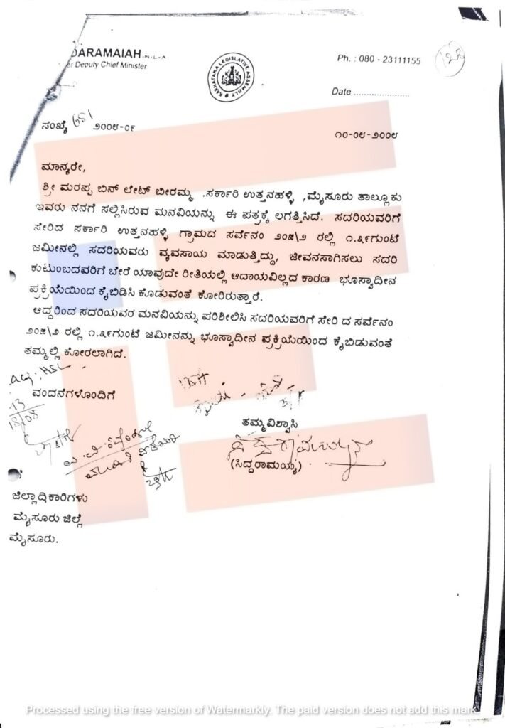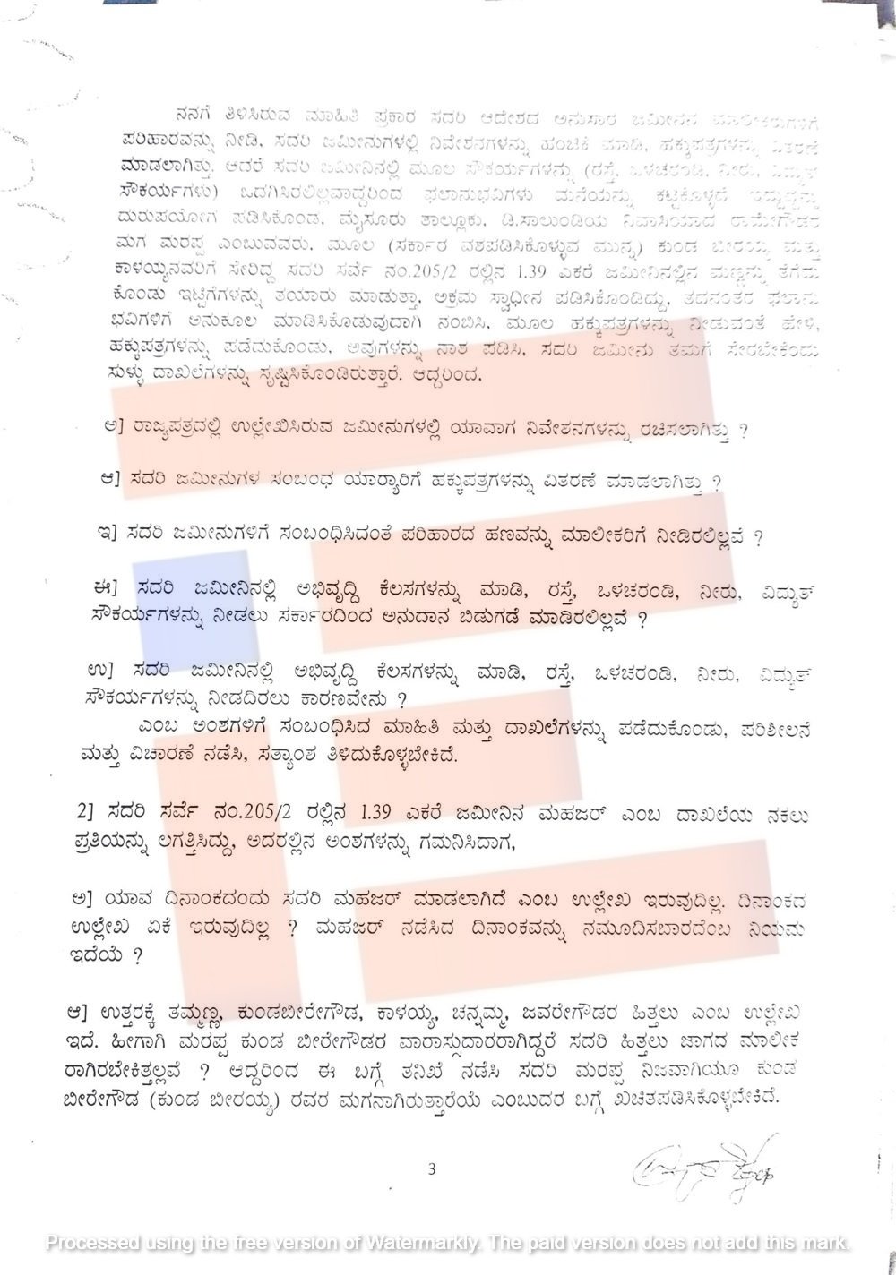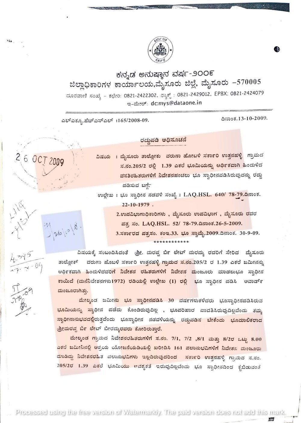 ಆದ್ದರಿಂದ ಸದರಿಯವರ ಮನವಿಯನ್ನು ಪರಿಶೀಲಿಸಿ ಸದರಿಯವರಿಗೆ ಸೇರಿದ ಸರ್ವೆ ನಂಬರ್ 205/2ರಲ್ಲಿ 1.39 ಗುಂಟೆ ಜಮೀನನ್ನು ಭೂ ಸ್ವಾಧೀನ ಪ್ರಕ್ರಿಯೆಯಿಂದ ಕೈಬಿಡುವಂತೆ ತಮ್ಮಲ್ಲಿ ಕೋರಲಾಗಿದೆ ಎಂದು ಮೈಸೂರಿನ ಜಿಲ್ಲಾಧಿಕಾರಿಗೆ 2008ರ ಆಗಸ್ಟ್ 10ರಂದು ಪತ್ರ ಬರೆದಿದ್ದರು.