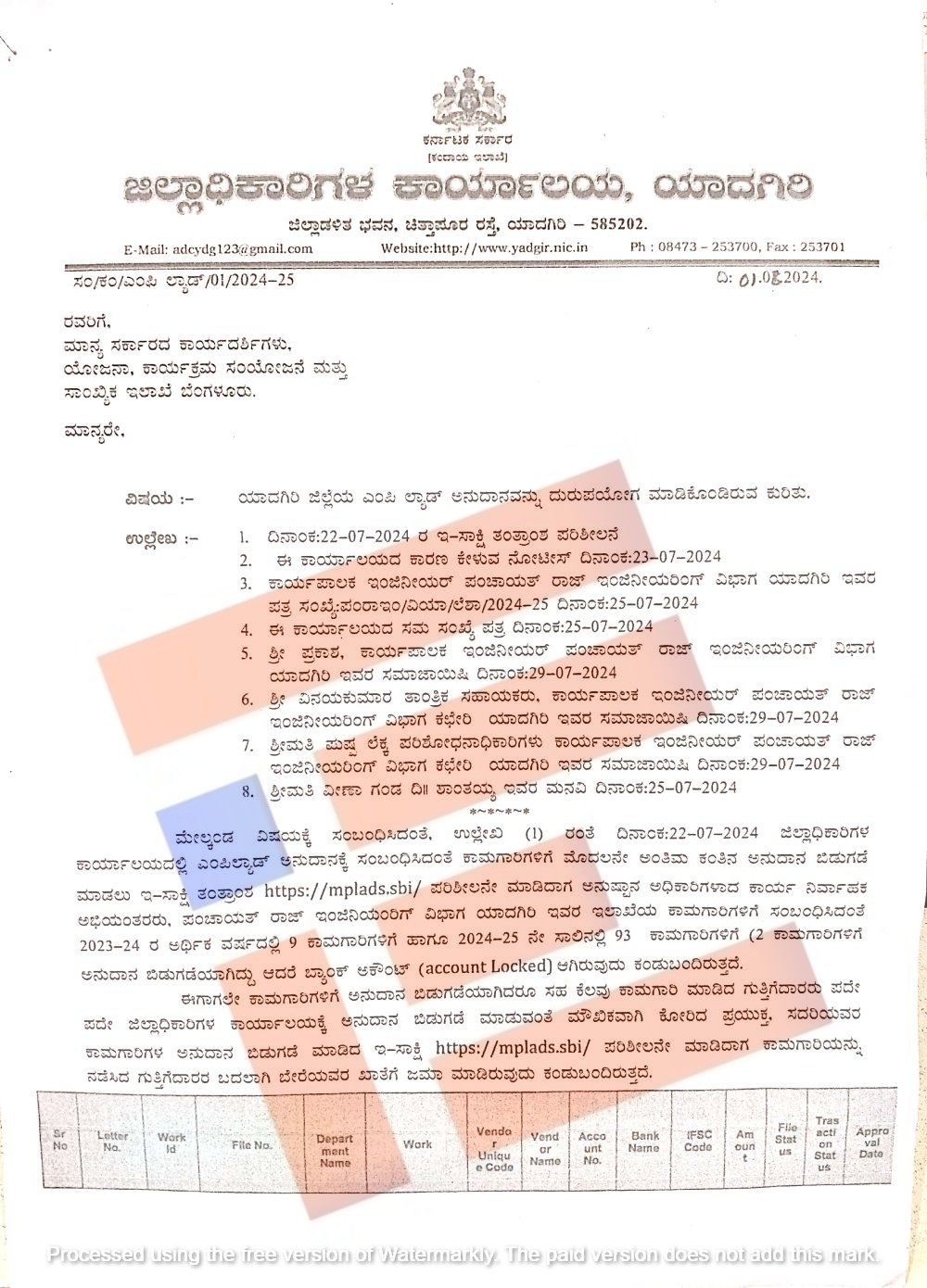 2023-24 ಮತ್ತು 2024-25ನೇ ಸಾಲಿನಲ್ಲಿ ಯಾದಗಿರಿ ಜಿಲ್ಲಾಧಿಕಾರಿಗಳ ಕಾರ್ಯವ್ಯಾಪ್ತಿಯಲ್ಲಿ ಎಂಪಿ ಲ್ಯಾಡ್‌ ಅನುದಾನಕ್ಕೆ ಸಂಬಂಧಿಸಿದಂತೆ ಮೊದಲನೇ ಅಂತಿಮ ಕಂತಿನ ಅನುದಾನ ಬಿಡುಗಡೆ ಮಾಡಲಾಗಿತ್ತು. ಈ ಸಂಬಂಧ ಇ-ಸಾಕ್ಷಿ ತಂತ್ರಾಂಶ (https;//mplads.sbi/) ಪರಿಶೀಲನೆ ಮಾಡಲಾಗಿತ್ತು.