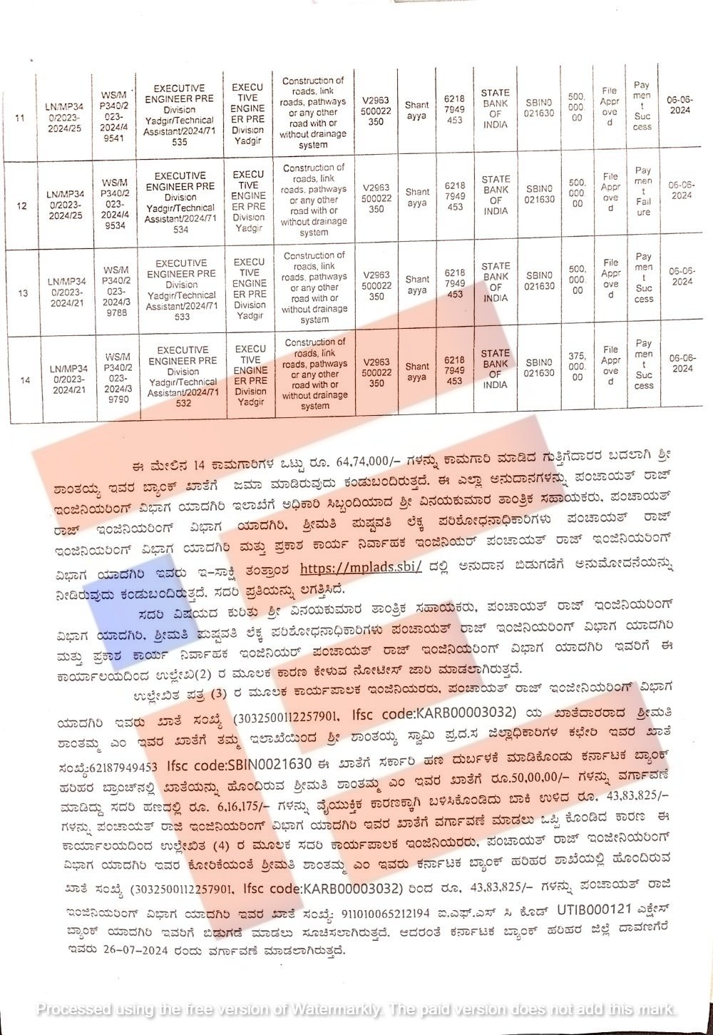 ಈ ಎಲ್ಲಾ ಅನುದಾನಗಳನ್ನು ಯಾದಗಿರಿ ಜಿಲ್ಲೆಯ ಪಂಚಾಯತ್‌ರಾಜ್‌ ಇಂಜನಿಯರಿಂಗ್‌ ವಿಭಾಗದ ತಾಂತ್ರಿಕ ಸಹಾಯಕ ವಿನಯಕುಮಾರ್‍‌, ಲೆಕ್ಕ ಪರಿಶೋಧನಾಕಾರಿಯಾದ ಪುಷ್ಪವತಿ, ಕಾರ್ಯನಿರ್ವಾಹಕ ಇಂಜಿನಿಯರ್‍‌ ಪ್ರಕಾಶ್‌ ಅವರು ಇ-ಸಾಕ್ಷಿ ತಂತ್ರಾಂಶದಲ್ಲಿ ಅನುದಾನ ಬಿಡುಗಡೆಗೆ ಅನುಮೋದನೆ ನೀಡಿದ್ದರು. ಇವರೆಲ್ಲರಿಗೂ ನೋಟೀಸ್‌ ಜಾರಿ ಮಾಡಲಾಗಿತ್ತು ಎಂದು ವರದಿಯಲ್ಲಿ ವಿವರಿಸಲಾಗಿದೆ.