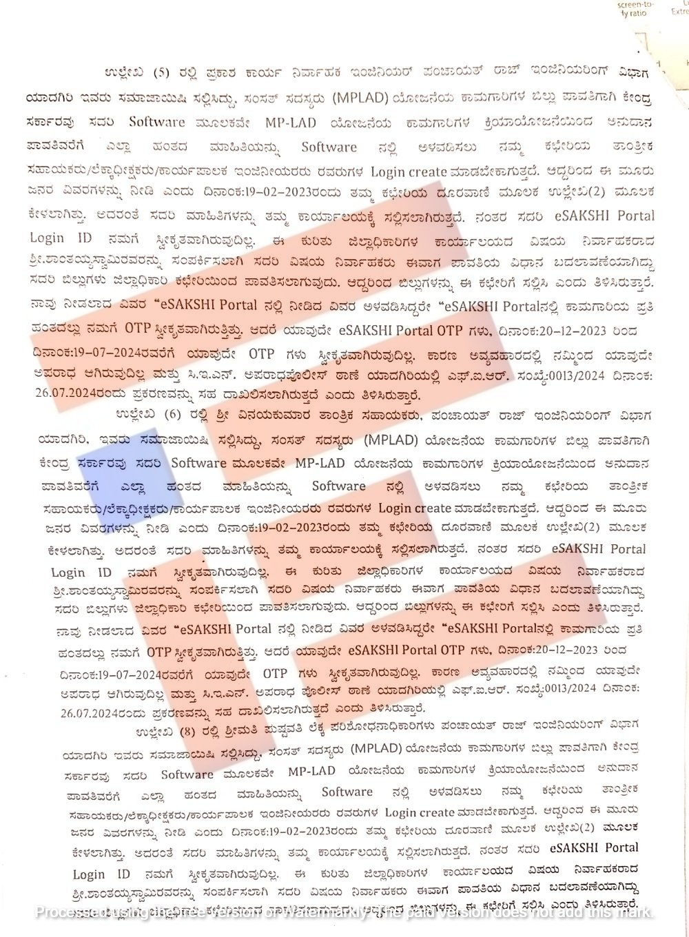 ಇ-ಸಾಕ್ಷಿ ಪೋರ್ಟಲ್‌ನಲ್ಲಿ ಎಲ್ಲಾ ವಿವರಗಳನ್ನು ಅಪ್ಲೋಡ್‌ ಮಾಡಬೇಕು. ವಿವರಗಳನ್ನು ಅಳವಡಿಸಿದ್ದರೇ ಕಾಮಗಾರಿಯ ಪ್ರತೀ ಹಂತದಲ್ಲೂ ಸಂಬಂಧಿಸಿದ ಅಧಿಕಾರಿಗಳಿಗೆ ಒಟಿಪಿ ಸ್ವೀಕೃತವಾಗಲಿದೆ. ಆದರೆ ಈ ಪ್ರಕರಣದಲ್ಲಿ ಸಂಬಂಧಿಸಿದ ಅಧಿಕಾರಿಗಳಿಗೆ ಯಾವುದೇ ಒಟಿಪಿ ಸ್ವೀಕೃತವಾಗಿಲ್ಲ ಎಂದು ವರದಿಯಿಂದ ತಿಳಿದು ಬಂದಿದೆ.