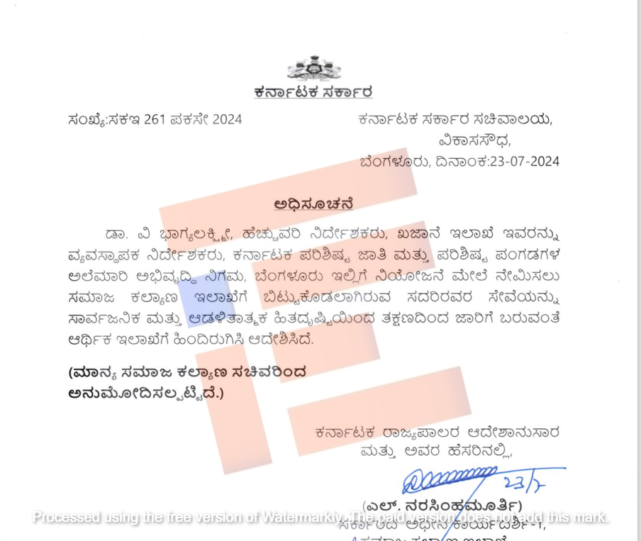 ಸರ್ಕಾರದ ಆದೇಶದಂತೆ ಡಾ ವಿ ಭಾಗ್ಯಲಕ್ಷ್ಮಿ ಅವರು ಕರ್ನಾಟಕ ಪರಿಶಿಷ್ಟ ಜಾತಿ ಮತ್ತು ಪರಿಶಿಷ್ಟ ಪಂಗಡಗಳ ಅಲೆಮಾರಿ ಅಭಿವೃದ್ಧಿ ನಿಗಮದ ವ್ಯವಸ್ಥಾಪಕ ನಿರ್ದೇಶಶಕರ ಹುದ್ದೆಯಲ್ಲಿ ಕಾರ್ಯವರದಿ ಮಾಡಿಕೊಳ್ಳಲು ತೆರಳಿದ್ದರು.