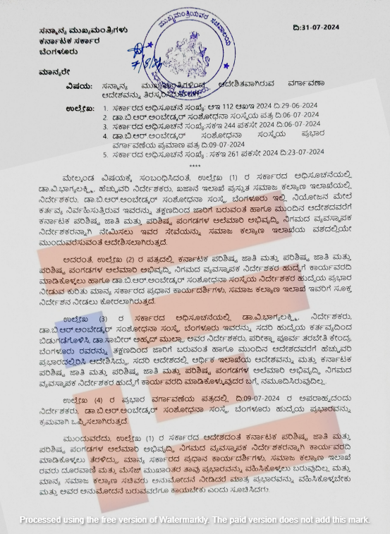 ಅಲ್ಲದೇ ಈ ಆದೇಶದಲ್ಲಿ ಆರ್ಥಿಕ ಇಲಾಖೆಯ ಆದೇಶವನನ್ನು ಮತ್ತು ಕರ್ನಾಟಕ ಪರಿಶಿಷ್ಟ ಜಾರಿ ಮತ್ತು ಪರಿಶಿಷ್ಟ ಪಂಗಡಗಳ ಅಲೆಮಾರಿ ನಿಗಮದ ವ್ಯವಸ್ಥಾಪಕ ನಿರ್ದೇಶಕರ ಹುದ್ದೆಗೆ ಕಾರ್ಯವರದಿ ಮಾಡಿಕೊಳ್ಳುವುದರ ಬಗ್ಗೆ ನಮೂದಿಸಿರಲಿಲ್ಲ ಎಂದು ಪತ್ರದಲ್ಲಿ ಉಲ್ಲೇಖಿಸಿರುವುದು ಗೊತ್ತಾಗಿದೆ.