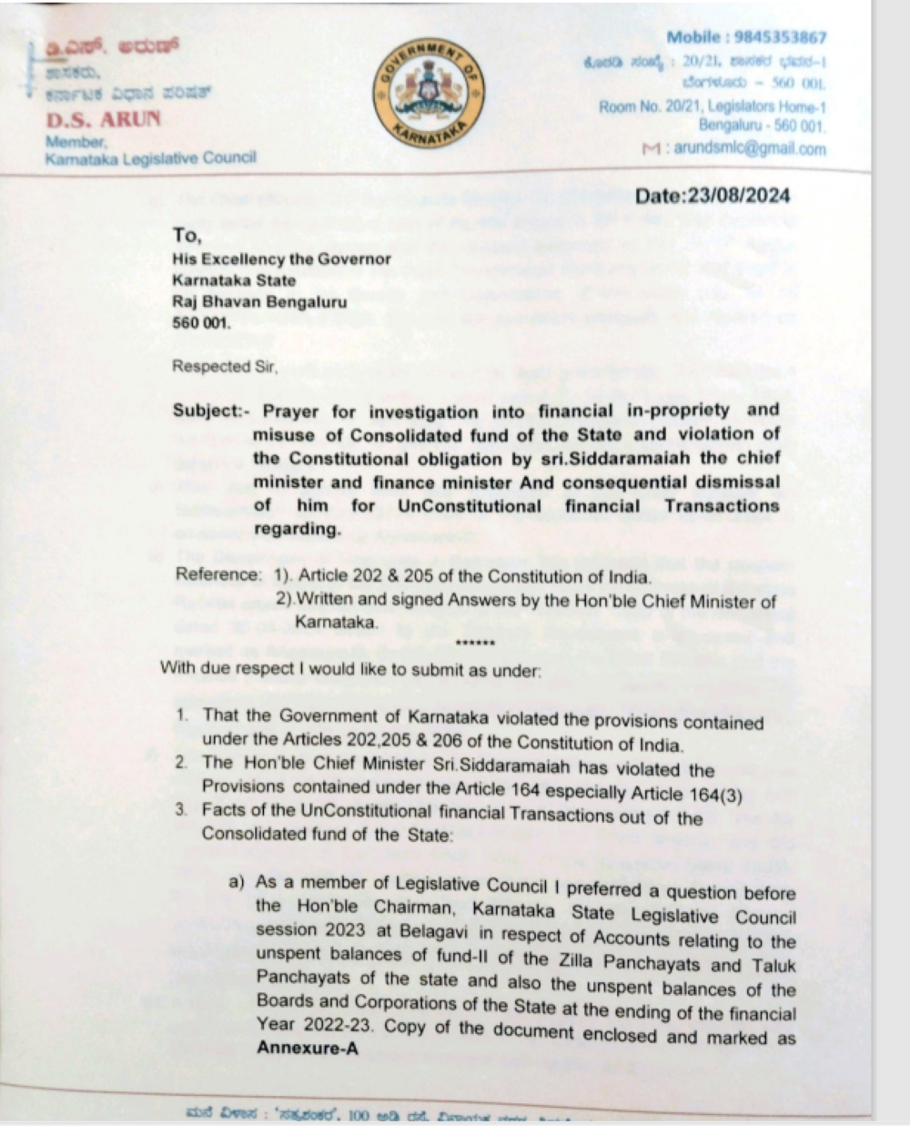 ಮುಡಾ ನಿವೇಶನ ಹಂಚಿಕೆ ಪ್ರಕರಣ ಸಂಬಂಧ ಸಿಎಂ ವಿರುದ್ಧ ಕಾನೂನು ಕ್ರಮಕ್ಕೆ ಅನುಮತಿ ನೀಡಿರುವ ಬೆನ್ನಲ್ಲೇ ಇದೀಗ ಜಿಲ್ಲಾ ಮತ್ತು ತಾಲೂಕು ಪಂಚಾಯತಿಗಳಲ್ಲಿ ಬಾಕಿ ಉಳಿದಿರುವ 1,494 ಕೋಟಿ ರೂ.ಹಣ ದುರ್ಬಳಕೆ ಸಂಬಂಧ ರಾಜ್ಯಪಾಲರಿಗೆ ವಿಧಾನ ಪರಿಷತ್ ಸದಸ್ಯ ಡಿ ಎಸ್ ಅರುಣ್ ಅವರು ನೀಡಿರುವ ದೂರು ಮಹತ್ವ ಪಡೆದುಕೊಂಡಿದೆ.