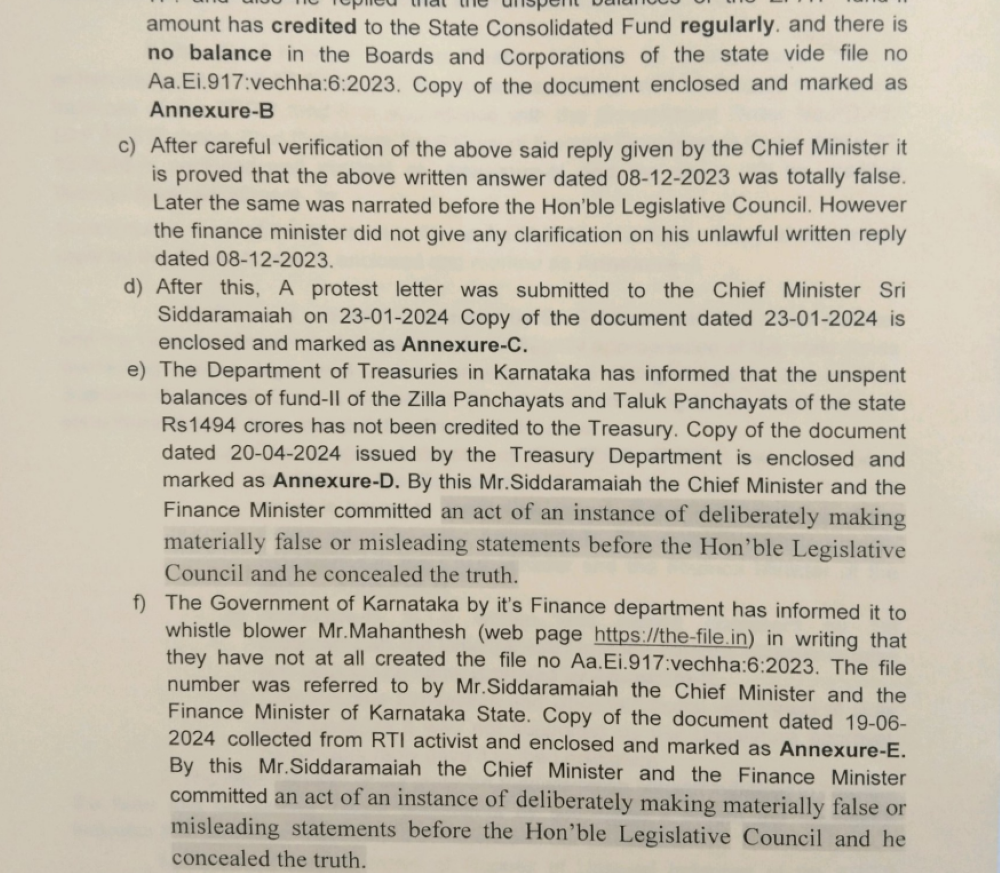 ಅಲ್ಲದೇ ಕರ್ನಾಟಕ ಖಜಾನೆ ಇಲಾಖೆಯು 1,494 ಕೋಟಿ ರು.ಗಳನ್ನು ಸ್ವೀಕರಿಸಿಲ್ಲ ಎಂದು 2024ರ ಏಪ್ರಿಲ್ 20ರಂದೇ ಉತ್ತರಿಸಿತ್ತು. ಈ ಮೂಲಕ ಹಣಕಾಸು ಸಚಿವರೂ ಆಗಿರುವ ಮುಖ್ಯಮಂತ್ರಿ ಸಿದ್ದರಾಮಯ್ಯ ಅವರು ಉದ್ದೇಶಪೂರ್ವಕವಾಗಿ ವಸ್ತುನಿಷ್ಟವಾಗಿ ಸುಳ್ಳು ಅಥವಾ ತಪ್ಪು ದಾರಿಗೆಳೆಯುವ ಹೇಳಿಕೆಗಳನ್ನು ನೀಡಿದ್ದಾರೆ. ಈ ಮೂಲಕ ವಿಧಾನ ಪರಿಷತ್ ಮುಂದೆ ಸತ್ಯವನ್ನು ಮರೆಮಾಚಿದ್ದಾರೆ ಎಂದು ದೂರಿನಲ್ಲಿ ವಿವರಿಸಿದ್ದಾರೆ.