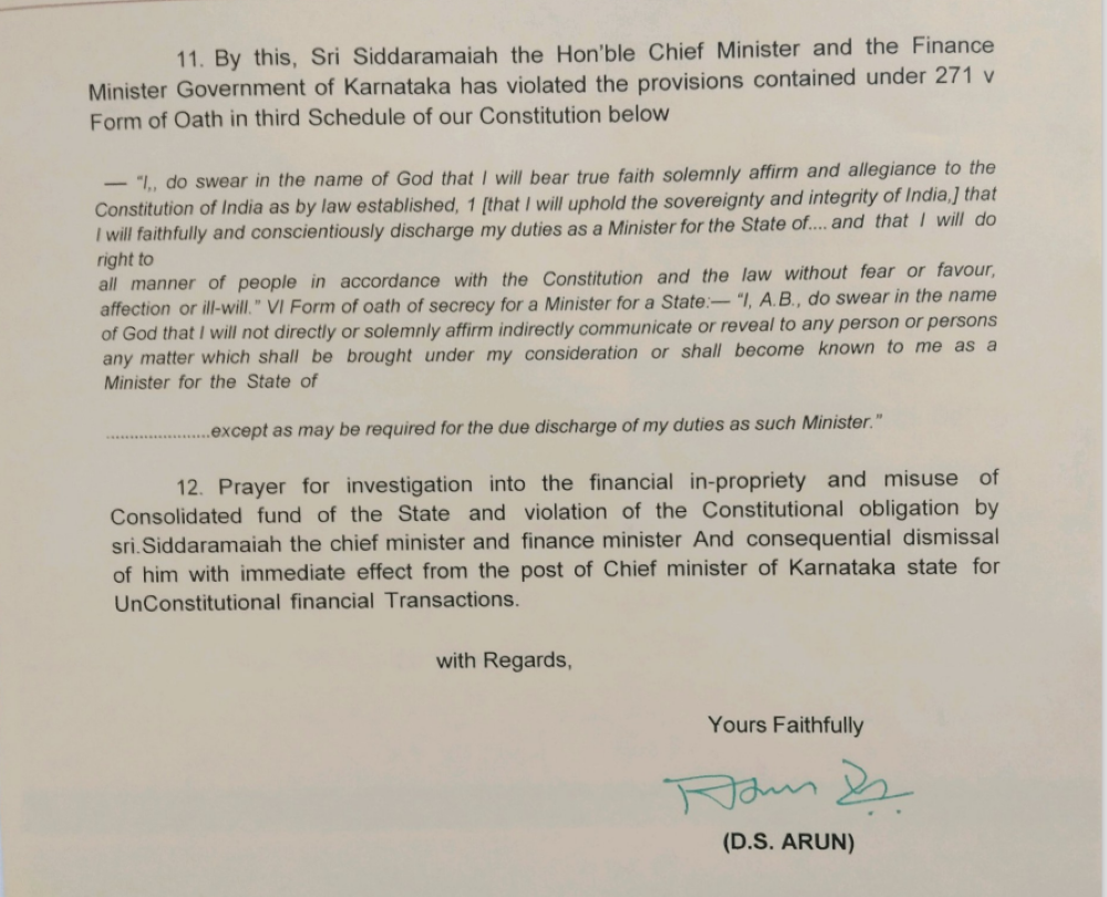 ಕರ್ನಾಟಕ ಸರ್ಕಾರವು ಭಾರತ ಸಂವಿಧಾನದ 202, 205 ಮತ್ತು 206ನೇ ವಿಧಿಗಳ ಅಡಿಯಲ್ಲಿ ಉಪಬಂಧಗಳನ್ನು ಉಲ್ಲಂಘಿಸಿದೆ. ಅಲ್ಲದೇ ಸಿದ್ದರಾಮಯ್ಯ ಅವರು ಸಂವಿಧಾನದ 164ನೇ ವಿಧಿ ವಿಶೇಷವಾಗಿ 164 (3) ವಿಧಿ ಅಡಿಯಲ್ಲಿ ಒಳಗೊಂಡಿರುವ ಉಪಬಂಧಗಳನ್ನೂ ಉಲ್ಲಂಘಿಸಿದ್ದಾರೆ. ಎಂದು ದೂರಿನಲ್ಲಿ ಉಲ್ಲೇಖಿಸಿರುವುದು ಗೊತ್ತಾಗಿದೆ.