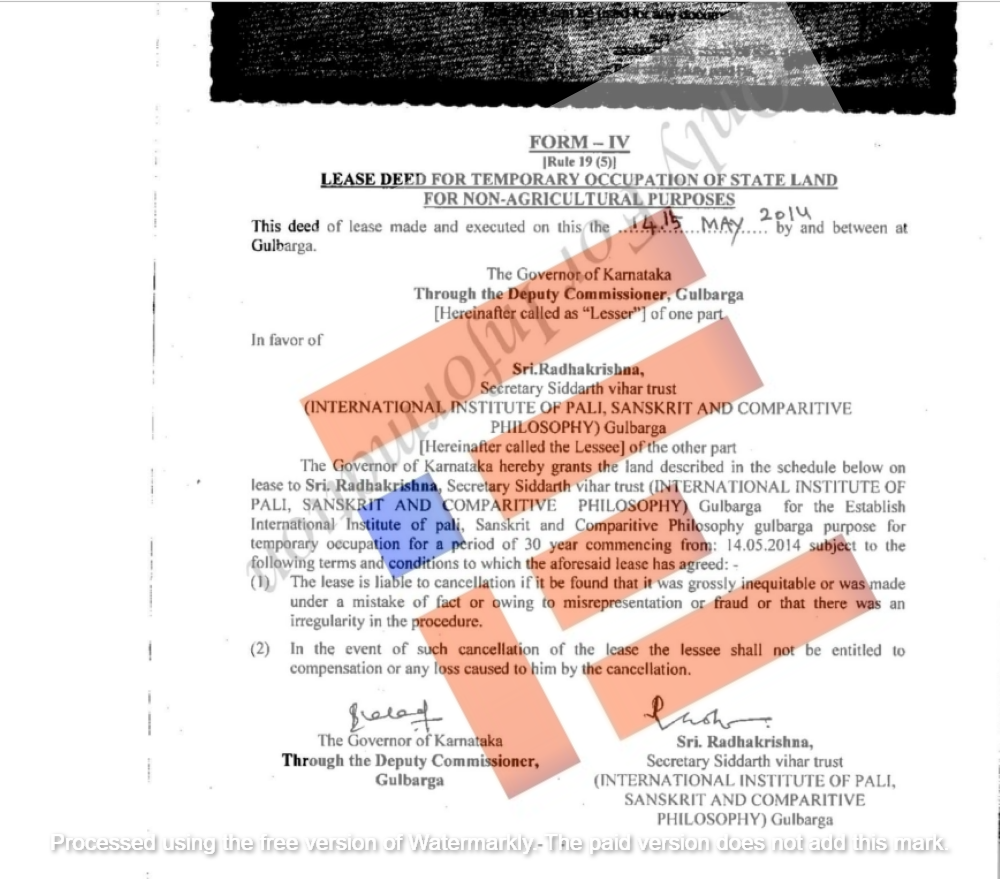 ಸಿದ್ದಾರ್ಥ ವಿಹಾರ್ ಟ್ರಸ್ಟ್ಗೆ 2014ರಲ್ಲಿ 30 ವರ್ಷಗಳ ಅವಧಿಗೆ ಗುತ್ತಿಗೆ ಆಧಾರದ ಮೇಲೆ ಜಮೀನು ಮಂಜೂರಾದ ನಂತರ ಕಲ್ಬುರ್ಗಿ ಜಿಲ್ಲಾಧಿಕಾರಿಯು ಟ್ರಸ್ಟ್ನ ಕಾರ್ಯದರ್ಶಿಯೂ ಆಗಿರುವ ಹಾಲಿ ಸಂಸದ ರಾಧಾಕೃಷ್ಣ ಅವರಿಗೆ ಲೀಸ್ ಡೀಡ್ ಮಾಡಿಕೊಟ್ಟಿದ್ದರು. ಇದರ ಪ್ರತಿಯೂ ‘ದಿ ಫೈಲ್’ಗೆ ಲಭ್ಯವಾಗಿದೆ.