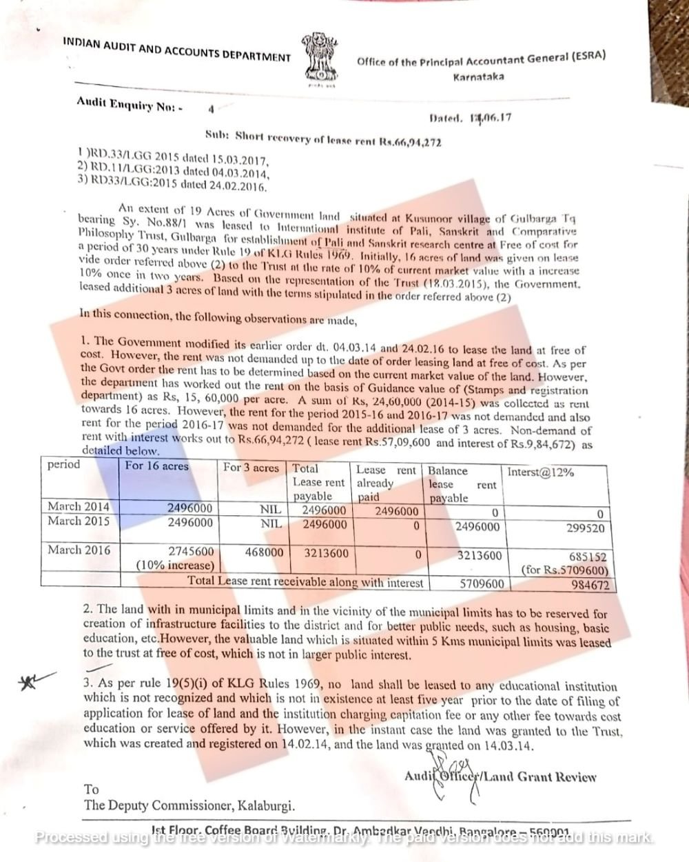 ಗುಲ್ಬರ್ಗ ತಾಲೂಕಿನ ಕುಸನೂರು ಗ್ರಾಮದ ಸರ್ವೆ ನಂಬರ್ 88/1ರ 19 ಎಕರೆ ಸರ್ಕಾರಿ ಜಾಗವನ್ನು ಅಂತರರಾಷ್ಟ್ರೀಯ ಪಾಲಿ, ಸಂಸ್ಕೃತ ತೌಲನಿಕ ತತ್ವಶಾಸ್ತ್ರ ಟ್ರಸ್ಟ್ ಗೆ ಉಚಿತವಾಗಿ ಮಂಜೂರು ಮಾಡಿದ್ದ ದಾಖಲೆಗಳು ಮುನ್ನೆಲೆಗೆ ಬಂದ ಹೊತ್ತಿನಲ್ಲಿಯೇ ಇದೇ ಪ್ರಕರಣದಲ್ಲಿ ಇಂಡಿಯನ್ ಆಡಿಟ್ ಅಂಡ್ ಅಕೌಂಟೆಂಟ್ ಜನರಲ್ ವ್ಯಕ್ತಪಡಿಸಿದ್ದ ಹಲವು ಆಕ್ಷೇಪಣೆಗಳೂ ಸಹ ಇದೀಗ ಚರ್ಚೆಗೆ ಗ್ರಾಸವಾಗಿದೆ.