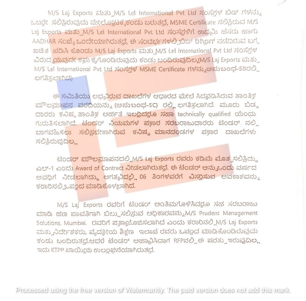 ‘ಲಾಜ್ ಎಕ್ಸ್ಪೋರ್ಟ್ಸ್ ಮತ್ತು ಎಲ್ಇಎಲ್ ಇಂಟರ್ ನ್ಯಾಷನಲ್ ಪ್ರೈವೈಟ್ ಲಿಮಿಟೆಡ್ ಸಂಸ್ಥೆಗಳ ಬಿಡ್ಗಳನ್ನು ಒಬ್ಬರೇ ಸಲ್ಲಿಸಿರುವುದು ಮೇಲ್ನೋಟಕ್ಕೆ ಕಂಡು ಬರುತ್ತದೆ. ಎಂಎಸ್ಎಂಇ ಪ್ರಮಾಣಪತ್ರದಲ್ಲಿ ಸಲ್ಲಿಸಿರುವ ಲಾಜ್ ಎಕ್ಸ್ಪೋರ್ಟ್ಸ್ ಮತ್ತು ಎಲ್ಇಎಲ್ ಇಂಟರ್ ನ್ಯಾಷನಲ್ ಪ್ರೈವೈಟ್ ಲಿಮಿಟೆಡ್ ಸಂಸ್ಥೆಗಳಿಗೆ ಉದ್ಯಮಿ ಹೆಸರು ಮತ್ತು ಆಧಾರ್ ಸಂಖ್ಯೆ ಒಂದೇ ಆಗಿದೆ. ಈ ಸಂದರ್ಭದಲ್ಲಿ ಬಿಡ್ ರಿಗ್ಗಿಂಗ್ ನಡೆದಿರುವ ಬಗ್ಗೆ ಖಚಿತಪಡಿಸಿಕೊಂಡು ಲಾಜ್ ಎಕ್ಸ್ಪೋರ್ಟ್ಸ್ ಮತ್ತು ಎಲ್ಇಎಲ್ ಇಂಟರ್ ನ್ಯಾಷನಲ್ ಪ್ರೈವೈಟ್ ಲಿಮಿಟೆಡ್ ಸಂಸ್ಥೆಗಳ ವಿರುದ್ಧ ಯಾವುದೇ ಕ್ರಮ ಕೈಗೊಂಡಿರುವುದಿಲ್ಲ,’ ಎಂದು ತನಿಖಾ ಸಮಿತಿಯು ವಿವರಿಸಿರುವುದು ತಿಳಿದು ಬಂದಿದೆ.