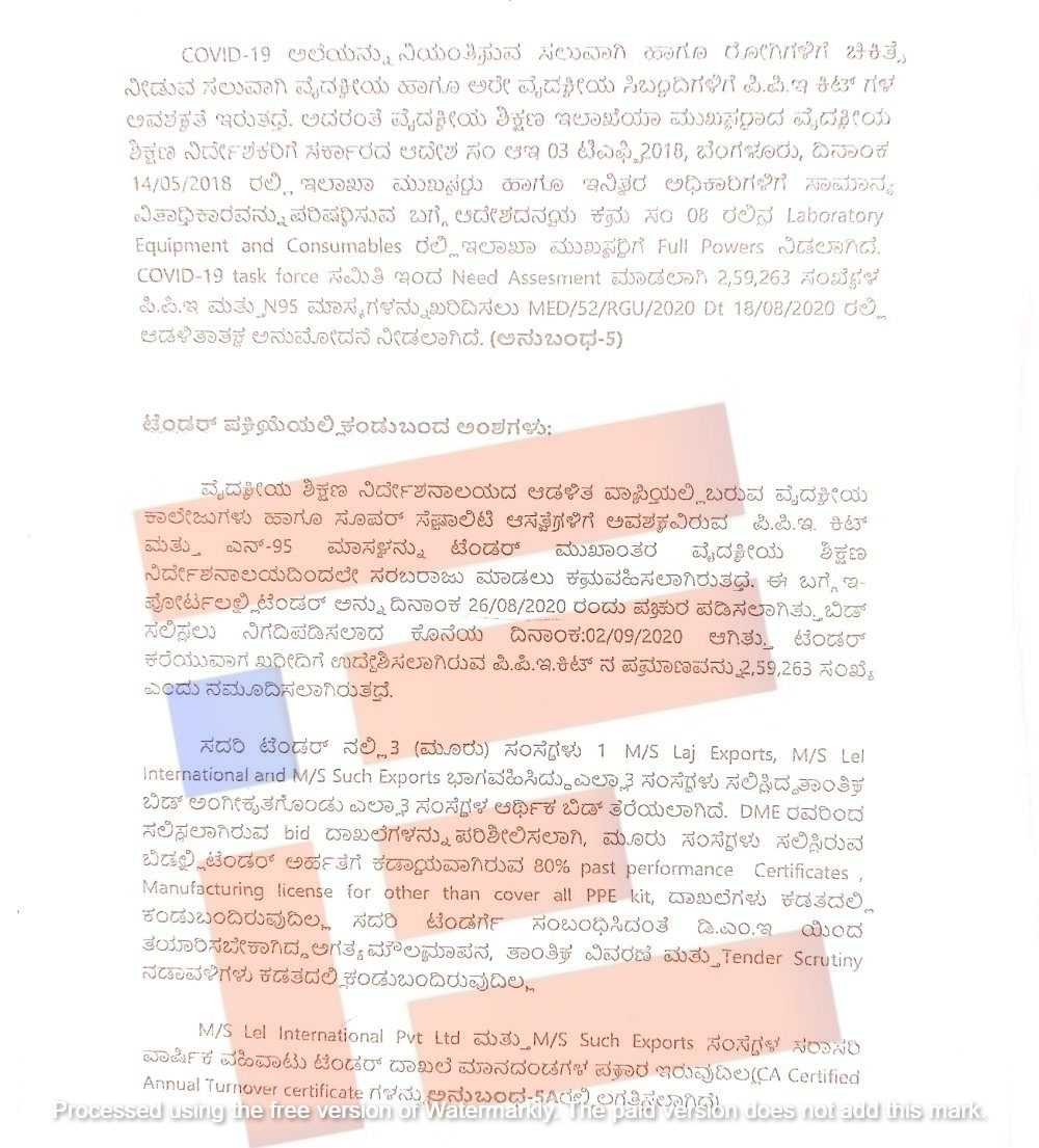 ವೈದ್ಯಕೀಯ ಶಿಕ್ಷಣ ನಿರ್ದೇಶನಾಲಯದ ಆಡಳಿತ ವ್ಯಾಪ್ತಿಯಲ್ಲಿನ ವೈದ್ಯಕೀಯ ಕಾಲೇಜುಗಳು, ಸೂಪರ್ ಸ್ಪೆಷಾಲಿಟಿ ಆಸ್ಪತ್ರೆಗಳಿಗೆ ಅವಶ್ಯಕವಿದ್ದ ಪಿಪಿಇ ಕಿಟ್ ಮತ್ತು ಎನ್-95 ಮಾಸ್ಕ್ಗಳನ್ನು ಟೆಂಡರ್ ಮೂಲಕ ಖರೀದಿಸಲು ಕ್ರಮ ವಹಿಸಿತ್ತು. ಈ ಸಂಬಂಧ 2020ರ ಆಗಸ್ಟ್ 26ರಂದು ಇ ಪೋರ್ಟಲ್ನಲ್ಲಿ ಟೆಂಡರ್ ಆಹ್ವಾನಿಸಿತ್ತು.