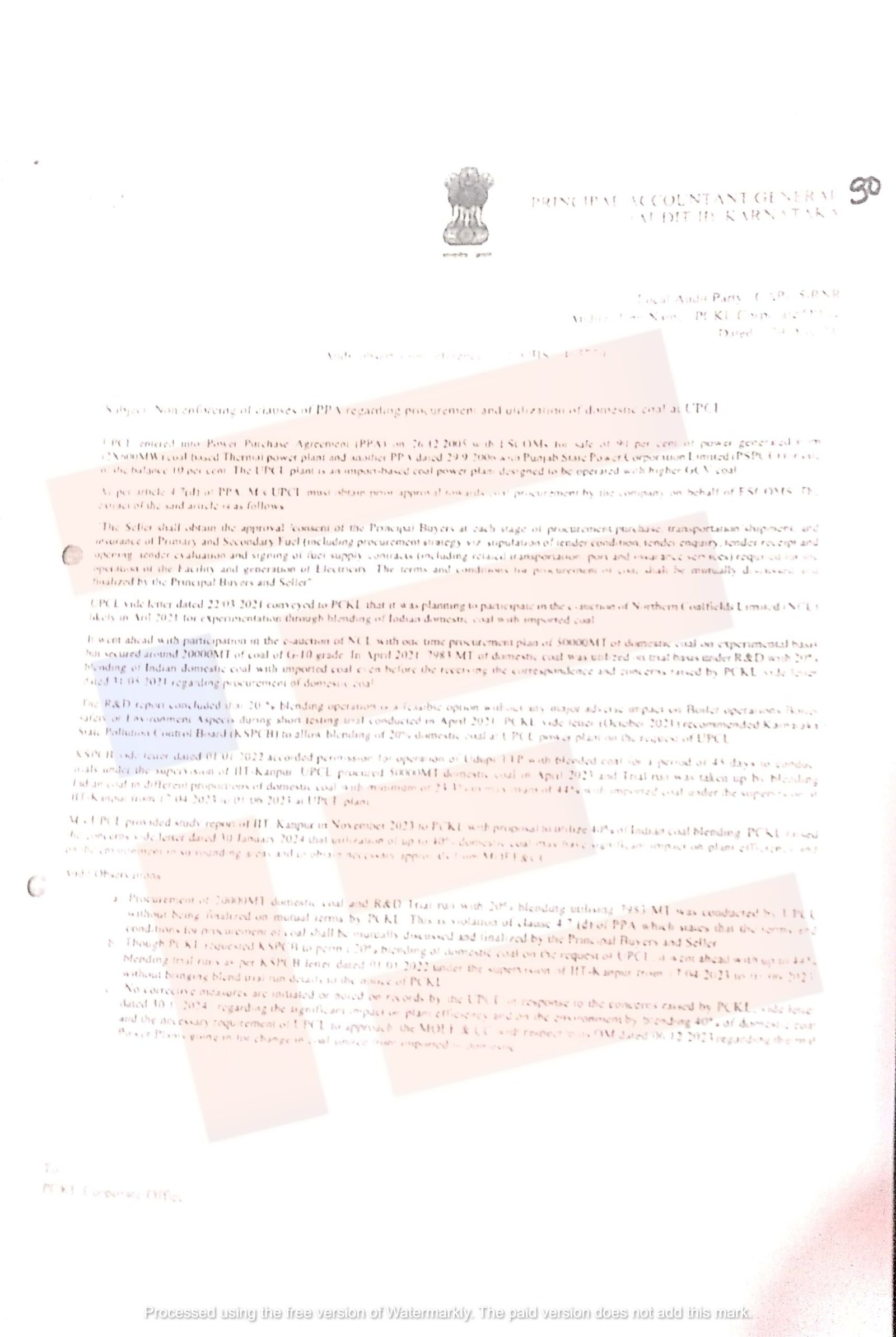 2,00. 000 ಮೆ. ಟನ್ ದೇಶೀಯ ಕಲ್ಲಿದ್ದಲು ಮತ್ತು ಆರ್ ಮತ್ತು ಡಿ ಟ್ರಯಲ್ ರನ್ 7, 983 ಮೆಟ್ರಿಕ್ ಟನ್ ಬಳಸಿ 20 ಪ್ರತಿಶತ ಶಕ್ತಿಯುತ ಮಿಶ್ರಣ ಪ್ರಕ್ರಿಯೆಯನ್ನು ಪಿಸಿಕೆಎಲ್ ಮೂಲಕ ಅಂತಿಮಗೊಳಿಸಿಲ್ಲ. ಬದಲಿಗೆ ಯುಪಿಸಿಎಲ್ ನೇರವಾಗಿ ನಡೆಸಿದೆ. ಇದು ಕಲ್ಲಿದ್ದಲು ಸಂಗ್ರಹಣೆಯ ನಿಯಮಗಳು ಮತ್ತು ಷರತ್ತುಗಳ ಉಲ್ಲಂಘನೆಯಾಗಿದೆ.