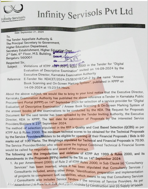 ಈ ಸಂಬಂಧ ಇನ್ಫಿನಿಟಿ ಸರ್ವಿಸೋಲ್ಸ್‌ ಪ್ರೈವೈಟ್‌ ಲಿಮಿಟೆಡ್‌, ಉನ್ನತ ಶಿಕ್ಷಣ ಇಲಾಖೆಯ ಸರ್ಕಾರದ ಪ್ರಧಾನ ಕಾರ್ಯದರ್ಶಿಗೆ ಲಿಖಿತ ದೂರು ಸಲ್ಲಿಸಿದೆ. ಈ ದೂರಿನ ಪ್ರತಿಯು ‘ದಿ ಫೈಲ್‌’ಗೆ ಲಭ್ಯವಾಗಿದೆ.