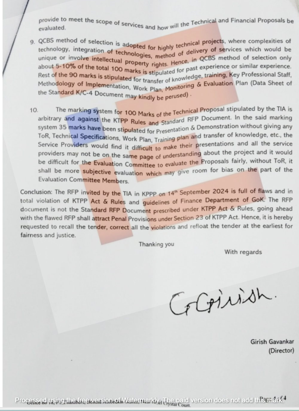 ಈ ಟೆಂಡರ್‍‌ನಲ್ಲಿ ಕೆಟಿಪಿಪಿ ಕಾಯ್ದೆಯ ನಿಯಮಗಳನ್ನು ಉಲ್ಲಂಘಿಸಲಾಗಿದೆ ಮತ್ತು ಪೂರ್ವ ನಿರ್ಧರಿತ ಕಂಪನಿಯಿಂದ ಈ ಸೇವೆ ಪಡೆಯಲು ತರಾತುರಿಯಲ್ಲಿ ಟೆಂಡರ್‍‌ ಪ್ರಕ್ರಿಯೆ ನಡೆಸುತ್ತಿದೆ ಎಂದು ದೂರಿನಲ್ಲಿ ವಿವರಿಸಲಾಗಿದೆ.