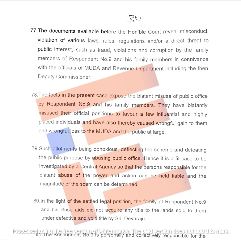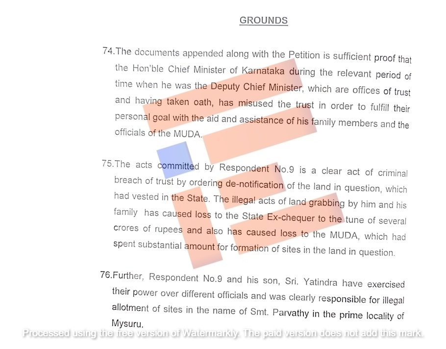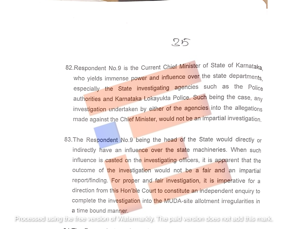9ನೇ ಪ್ರತಿವಾದಿ ರಾಜ್ಯದ ಮುಖ್ಯಸ್ಥರಾಗಿದ್ದಾರೆ. ಹೀಗಾಗಿ ನೇರವಾಗಿ ಅಥವಾ ಪರೋಕ್ಷವಾಗಿ ರಾಜ್ಯ ಆಡಳಿತದ ಮೇಲೆ ಪ್ರಭಾವ ಬೀರುತ್ತದೆ. ತನಿಖಾಧಿಕಾರಿಗಳ ಮೇಲೆ ಅಂತಹ ಪ್ರಭಾವವನ್ನು ಬೀರಿದಾಗ, ತನಿಖೆಯ ಫಲಿತಾಂಶವು ನ್ಯಾಯಯುತ ಮತ್ತು ನಿಷ್ಪಕ್ಷಪಾತ ವರದಿ/ಶೋಧನೆಯಾಗುವುದಿಲ್ಲ ಎಂಬುದು ಸ್ಪಷ್ಟ. ಮುಡಾ ನಿವೇಶನ ಹಂಚಿಕೆ ಅಕ್ರಮಗಳ ತನಿಖೆಯನ್ನು ಸರಿಯಾದ ಮತ್ತು ನ್ಯಾಯಸಮ್ಮತವಾದ ತನಿಖೆಗಾಗಿ, ಕಾಲಮಿತಿಯಲ್ಲಿ ಪೂರ್ಣಗೊಳಿಸಲು ಸ್ವತಂತ್ರ ತನಿಖೆಗೆ ಒಪ್ಪಿಸಲು ನ್ಯಾಯಾಲಯವು ನಿರ್ದೇಶನ ನೀಡಬೇಕು ಎಂದೂ ಕೋರಿರುವುದು ಗೊತ್ತಾಗಿದೆ.