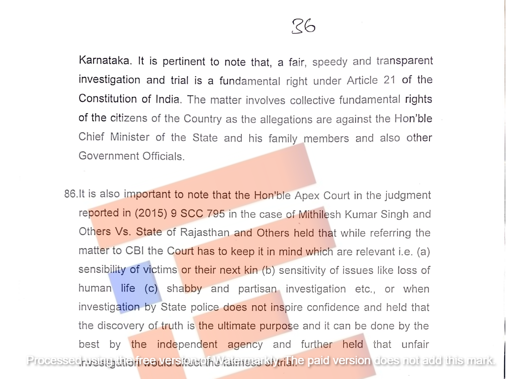 ಅದೇ ರೀತಿ ಭಾರತದ ಸಂವಿಧಾನದ 21 ನೇ ವಿಧಿಯ ಅಡಿಯಲ್ಲಿ ನ್ಯಾಯಯುತ, ತ್ವರಿತ ಮತ್ತು ಪಾರದರ್ಶಕ ತನಿಖೆ ಮತ್ತು ವಿಚಾರಣೆಯು ಮೂಲಭೂತ ಹಕ್ಕಾಗಿದೆ. ಈ ವಿಷಯವು ದೇಶದ ನಾಗರಿಕರ ಸಾಮೂಹಿಕ ಮೂಲಭೂತ ಹಕ್ಕುಗಳನ್ನು ಒಳಗೊಂಡಿರುತ್ತದೆ. ಏಕೆಂದರೆ ಆರೋಪಗಳು ರಾಜ್ಯದ ಮುಖ್ಯಮಂತ್ರಿ ಮತ್ತು ಅವರ ಕುಟುಂಬ ಸದಸ್ಯರು ಮತ್ತು ಇತರ ಸರ್ಕಾರಿ ಅಧಿಕಾರಿಗಳ ವಿರುದ್ಧವೂ ಇವೆ ಎಂದು ಸಂವಿಧಾನದ ವಿಧಿಯನ್ನು ಉಲ್ಲೇಖಿಸಿರುವುದು ತಿಳಿದು ಬಂದಿದೆ.