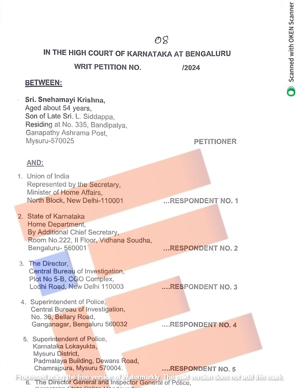ಸ್ನೇಹಮಯಿ ಕೃಷ್ಣ ಅವರು ಹೈಕೋರ್ಟ್‌ನಲ್ಲಿ ಸಲ್ಲಿಸಿರುವ ರಿಟ್‌ ಅರ್ಜಿಯು ‘ದಿ ಫೈಲ್‌’ಗೆ ಲಭ್ಯವಾಗಿದೆ.