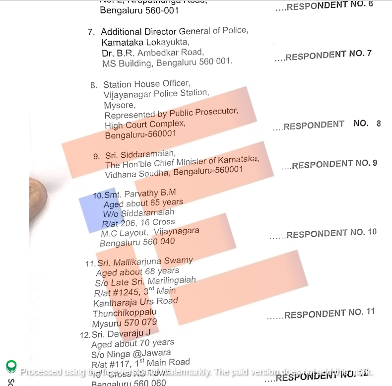 ಈ ರಿಟ್‌ ಅರ್ಜಿಯಲ್ಲಿ ಕೇಂದ್ರ ಸರ್ಕಾರವನ್ನು ಮೊದಲ ಪ್ರತಿವಾದಿ ಮತ್ತು ಮುಖ್ಯಮಂತ್ರಿ ಸಿದ್ದರಾಮಯ್ಯ ಅವರನ್ನು 9ನೇ ಪ್ರತಿವಾದಿಯನ್ನಾಗಿಸಿದ್ದಾರೆ. 10ನೇ ಪ್ರತಿವಾದಿಯನ್ನಾಗಿ ಸಿದ್ದರಾಮಯ್ಯ ಅವರ ಪತ್ನಿ ಪಾರ್ವತಿ ಮತ್ತು ಅವರ ಭಾಮೈದುನ ಮಲ್ಲಿಕಾರ್ಜುನ ಸ್ವಾಮಿ 11ನೇ ಪ್ರತಿವಾದಿಯನ್ನಾಗಿಸಿರುವುದು ಗೊತ್ತಾಗಿದೆ.