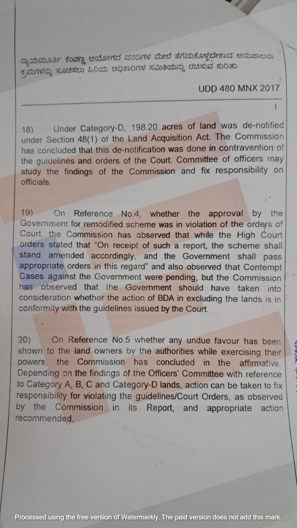 ನ್ಯಾಯಮೂರ್ತಿ ಕೆಂಪಣ್ಣ ಆಯೋಗವು ಐದು ನಿಯಮಗಳ ಉಲ್ಲೇಖದ ಕುರಿತು ತನ್ನ ಸಂಶೋಧನೆಗಳೊಂದಿಗೆ ಬೃಹತ್ ವರದಿಯನ್ನು ಸಲ್ಲಿಸಿತ್ತು. (ಟಿಪ್ಪಣಿ ಕಂಡಿಕೆ 13) ಉಲ್ಲೇಖ 1 ಅಡಿಯಲ್ಲಿ ಕೈಬಿಡಲು /ಡಿ-ನೋಟಿಫಿಕೇಶನ್‌ಗೆ ಸಂಬಂಧಿಸಿದ ವಿವಿಧ ವರ್ಗಗಳ ಭೂಮಿ, ಒಟ್ಟು 983.33 ಎಕರೆ ಮತ್ತು ಈ ಪ್ರಕ್ರಿಯೆಯಲ್ಲಿ ನ್ಯಾಯಾಲಯದ ಆದೇಶಗಳನ್ನು ಉಲ್ಲಂಘಿಸಿದೆಯೇ (ಟಿಪ್ಪಣಿ ಕಂಡಿಕೆ 14) ಎಂಬ ಕುರಿತು ವಿಚಾರಣೆ ನಡೆಸಿತ್ತು.