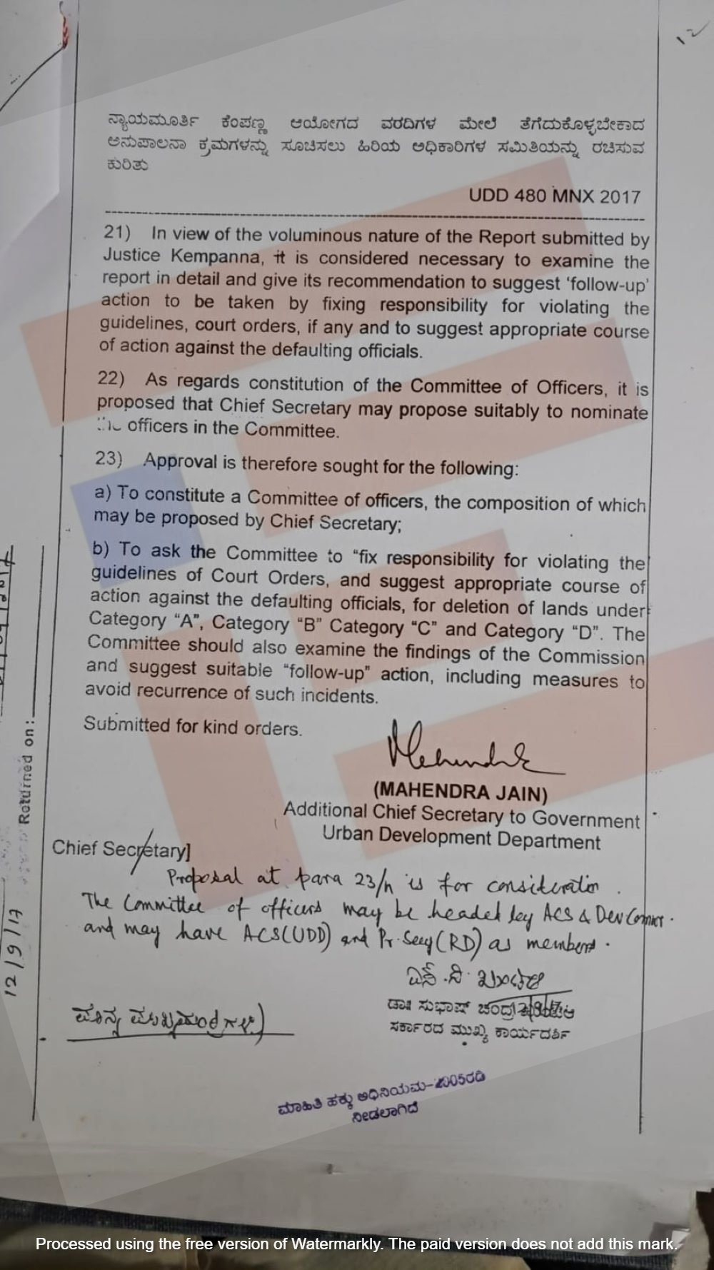 ‘ಪ್ರವರ್ಗ-ಡಿ ಅಡಿಯಲ್ಲಿ 198.20 ಎಕರೆ ಭೂಮಿಯನ್ನು ಭೂಸ್ವಾಧೀನ ಕಾಯ್ದೆಯ ಸೆಕ್ಷನ್ 48(1) ಅಡಿಯಲ್ಲಿ ಡಿ-ನೋಟಿಫೈ ಮಾಡಲಾಗಿದೆ. ನ್ಯಾಯಾಲಯದ ಮಾರ್ಗಸೂಚಿಗಳು ಮತ್ತು ಆದೇಶಗಳಿಗೆ ವಿರುದ್ಧವಾಗಿ  ಡಿ-ನೋಟಿಫಿಕೇಶನ್ ಮಾಡಲಾಗಿದೆ ಎಂದು ಆಯೋಗವು ತೀರ್ಮಾನಿಸಿದೆ. ಅಧಿಕಾರಿಗಳ ಉಪ ಸಮಿತಿಯು ಆಯೋಗದ ಸಂಶೋಧನೆಗಳನ್ನು ಅಧ್ಯಯನ ಮಾಡಬಹುದು ಮತ್ತು ಅಧಿಕಾರಿಗಳ ಮೇಲೆ ಜವಾಬ್ದಾರಿಯನ್ನು ನಿಗದಿಪಡಿಸಬಹುದು ಎಂದು  ಸೂಚಿಸಿದೆ,’ ಎಂದು ಮಹೇಂದ್ರ ಜೈನ್‌ ಅವರು ಟಿಪ್ಪಣಿ ಹಾಳೆಯಲ್ಲಿ ( ಟಿಪ್ಪಣಿ ಕಂಡಿಕೆ- 18)  ಉಲ್ಲೇಖಿಸಿರುವುದು ಗೊತ್ತಾಗಿದೆ.