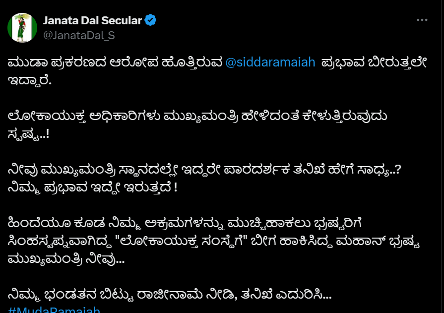 ‘ಮುಡಾ ಪ್ರಕರಣದ ಆರೋಪ ಹೊತ್ತಿರುವ ಸಿದ್ದರಾಮಯ್ಯ ಪ್ರಭಾವ ಬೀರುತ್ತಲೇ ಇದ್ದಾರೆ. ಲೋಕಾಯುಕ್ತ ಅಧಿಕಾರಿಗಳು ಮುಖ್ಯಮಂತ್ರಿ ಹೇಳಿದಂತೆ ಕೇಳುತ್ತಿರುವುದು ಸ್ಪಷ್ಟ..! ನೀವು ಮುಖ್ಯಮಂತ್ರಿ ಸ್ಥಾನದಲ್ಲೇ ಇದ್ದರೇ ಪಾರದರ್ಶಕ ತನಿಖೆ ಹೇಗೆ ಸಾಧ್ಯ..? ನಿಮ್ಮ ಪ್ರಭಾವ ಇದ್ದೇ ಇರುತ್ತದೆ ! ಹಿಂದೆಯೂ ಕೂಡ ನಿಮ್ಮ ಅಕ್ರಮಗಳನ್ನು ಮುಚ್ಚಿಹಾಕಲು ಭ್ರಷ್ಟರಿಗೆ ಸಿಂಹಸ್ವಪ್ನವಾಗಿದ್ದ “ಲೋಕಾಯುಕ್ತ ಸಂಸ್ಥೆಗೆ” ಬೀಗ ಹಾಕಿಸಿದ್ದ ಮಹಾನ್ ಭ್ರಷ್ಟ ಮುಖ್ಯಮಂತ್ರಿ ನೀವು… ನಿಮ್ಮ ಭಂಡತನ ಬಿಟ್ಟು ರಾಜೀನಾಮೆ ನೀಡಿ, ತನಿಖೆ ಎದುರಿಸಿ, ‘ ಎಂದು ಎಕ್ಸ್ ನಲ್ಲಿ ಟೀಕಿಸಿದೆ.