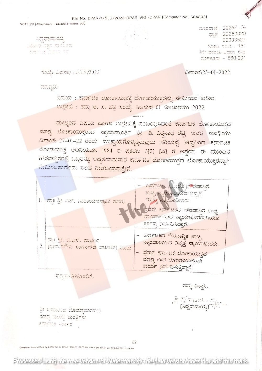 ವಿಧಾನಸಭೆ ಪ್ರತಿಪಕ್ಷ ನಾಯಕ ಸಿದ್ದರಾಮಯ್ಯ, ವಿಧಾನಪರಿಷತ್ ಪ್ರತಿಪಕ್ಷ ನಾಯಕ ಬಿ ಕೆ ಹರಿಪ್ರಸಾದ್ ಅವರು ಎಡಗೈ ಸಮುದಾಯಕ್ಕೆ ಸೇರಿರುವ ಹಿಮಾಚಲ ಪ್ರದೇಶದ ಉಚ್ಛ ನ್ಯಾಯಾಲಯ ನಿವೃತ್ತ ಮುಖ್ಯ ನ್ಯಾಯಾಧೀಶರಾಗಿ ಕಾರ್ಯನಿರ್ವಹಿಸಿದ್ದ ಎಲ್ ನಾರಾಯಣಸ್ವಾಮಿ (ಕರ್ನಾಟಕ ಹೈಕೋರ್ಟ್ನ ನ್ಯಾಯಾಧೀಶರಾಗಿಯೂ ಸೇವೆ ಸಲ್ಲಿಸಿದ್ದರು) ಅವರ ಹೆಸರನ್ನು ಶಿಫಾರಸ್ಸು ಮಾಡಿದ್ದಾರಾದರೂ ಇದೇ ಶಿಫಾರಸ್ಸಿನ ಪಟ್ಟಿಯಲ್ಲಿ ಬಿ ಎಸ್ ಪಾಟೀಲ್ ಅವರ ಹೆಸರೂ ಕೂಡ ಇತ್ತು. ಕಡೆಯಲ್ಲಿ ಬಿ ಎಸ್ ಪಾಟೀಲ್ ಅವರನ್ನೇ ಹಿಂದಿನ ಬಿಜೆಪಿ ಸರ್ಕಾರವು ಲೋಕಾಯುಕ್ತರನ್ನಾಗಿ ನೇಮಿಸಿತ್ತು.