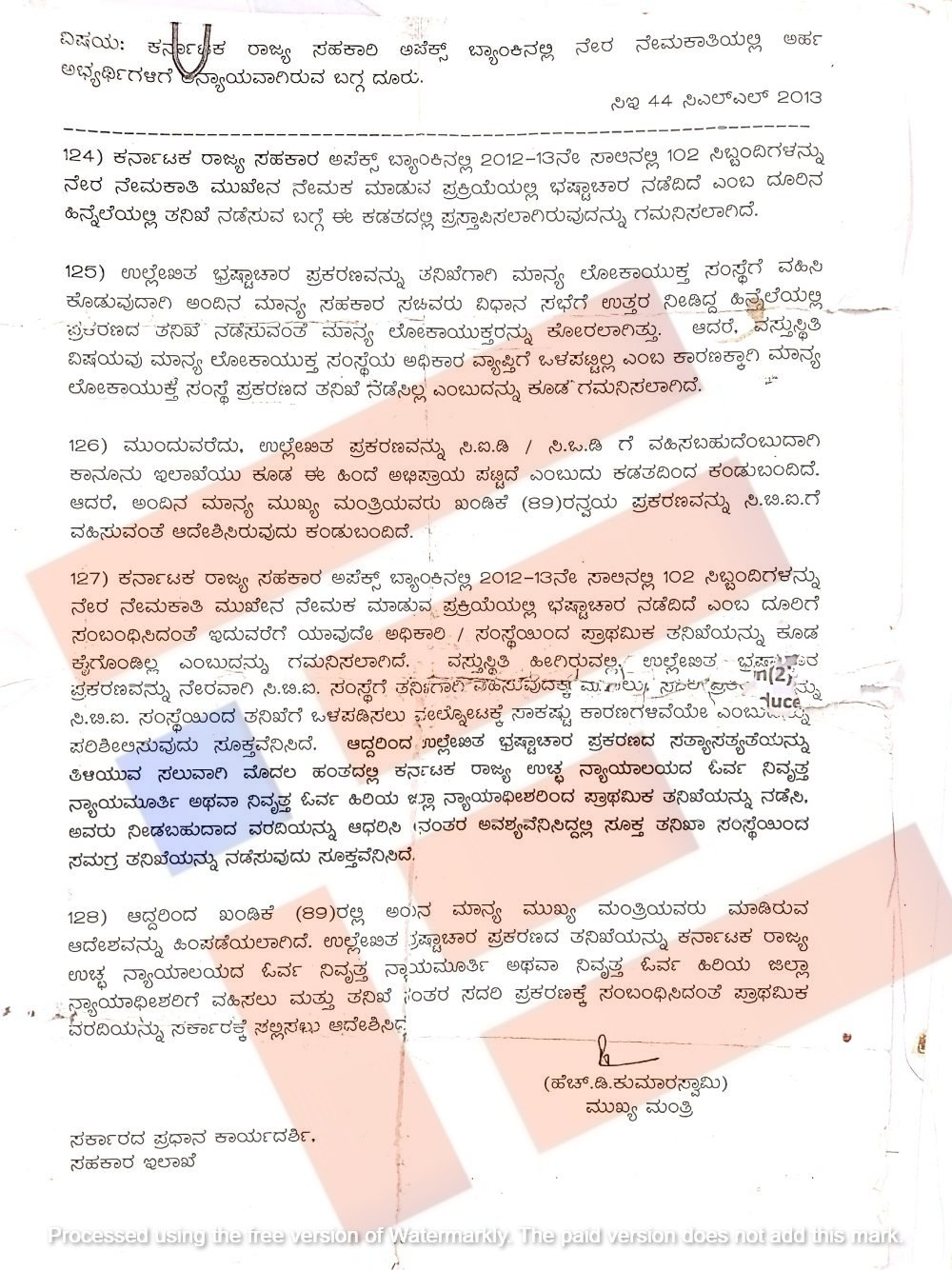 ಹೀಗಾಗಿ ಅಂದಿನ ಮುಖ್ಯಮಂತ್ರಿ ಮಾಡಿರುವ ಆದೇಶವನ್ನು (ಖಂಡಿಕೆ (89)ರಲ್ಲಿ ಹಿಂಪಡೆದಿತ್ತು. ಉಲ್ಲೇಖಿತ ಭ್ರಷ್ಟಾಚಾರ ಪ್ರಕರಣದ ತನಿಖೆಯನ್ನು ಕರ್ನಾಟಕ ರಾಜ್ಯ ಉಚ್ಛ ನ್ಯಾಯಾಲಯದ ಓರ್ವ ನಿವೃತ್ತ ನ್ಯಾಯಮೂರ್ತಿ ಅಥವಾ ಓರ್ವ ಹಿರಿಯ ಜಿಲ್ಲಾ ನ್ಯಾಯಾಧೀಶರಿಗೆ ವಹಿಸಬೇಕು. ಮತ್ತು ತನಿಖೆ ನಂತರ ಸದರಿ ಪ್ರಕರಣಕ್ಕೆ ಸಂಬಂಧಿಸಿದಂತೆ ಪ್ರಾಥಮಿಕ ವರದಿಯನ್ನು ಸರ್ಕಾರಕ್ಕೆ ಸಲ್ಲಿಸಬೇಕು ಎಂದು ಮುಖ್ಯಮಂತ್ರಿಯಾಗಿದ್ದ ಹೆಚ್ ಡಿ ಕುಮಾರಸ್ವಾಮಿ ಅವರು ಸಹಕಾರ ಇಲಾಖೆಯ ಸರ್ಕಾರದ ಪ್ರಧಾನ ಕಾರ್ಯದರ್ಶಿಗೆ ಟಿಪ್ಪಣಿಯಲ್ಲಿ ಸೂಚಿಸಿರುವುದು ತಿಳಿದು ಬಂದಿದೆ.