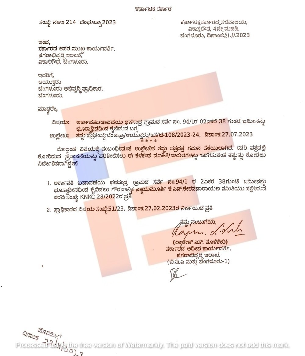 ಈ ಬೆಳವಣಿಗೆಳ ನಡುವೆಯೇ ಅರ್ಕಾವತಿ ಬಡಾವಣೆಯ ಥಣಿಸಂದ್ರ ಗ್ರಾಮದ ಸರ್ವೇ ನಂಬರ್ 94/1ರಲ್ಲಿನ 2.38 ಎಕರೆ ಜಮೀನನ್ನು ಭೂ ಸ್ವಾಧೀನದಿಂದ ಕೈಬಿಡುವ ಸಂಬಂಧ ನಗರಾಭಿವೃದ್ಧಿ ಇಲಾಖೆಯು ಬೆಂಗಳೂರು ಅಭಿವೃದ್ಧಿ ಪ್ರಾಧಿಕಾರದಿಂದ ವರದಿ ಕೇಳಿದೆ. ಈ ಸಂಬಂಧ 2023ರ ನವೆಂಬರ್ 21ರಲ್ಲೇ ನಗರಾಭಿವೃದ್ಧಿ ಇಲಾಖೆಯ ಸರ್ಕಾರದ ಹೆಚ್ಚುವರಿ ಮುಖ್ಯ ಕಾರ್ಯದರ್ಶಿ ಬಿಡಿಎ ಆಯುಕ್ತರಿಗೆ ಪತ್ರ ಬರೆದಿದ್ದಾರೆ. ಈ ಪತ್ರದ (ಸಂಖ್ಯೆ; ನಅಇ 214 ಬೆಂಭೂಸ್ವಾ 2023 ) ಪ್ರತಿಯು ‘ದಿ ಫೈಲ್’ಗೆ ಲಭ್ಯವಾಗಿದೆ.