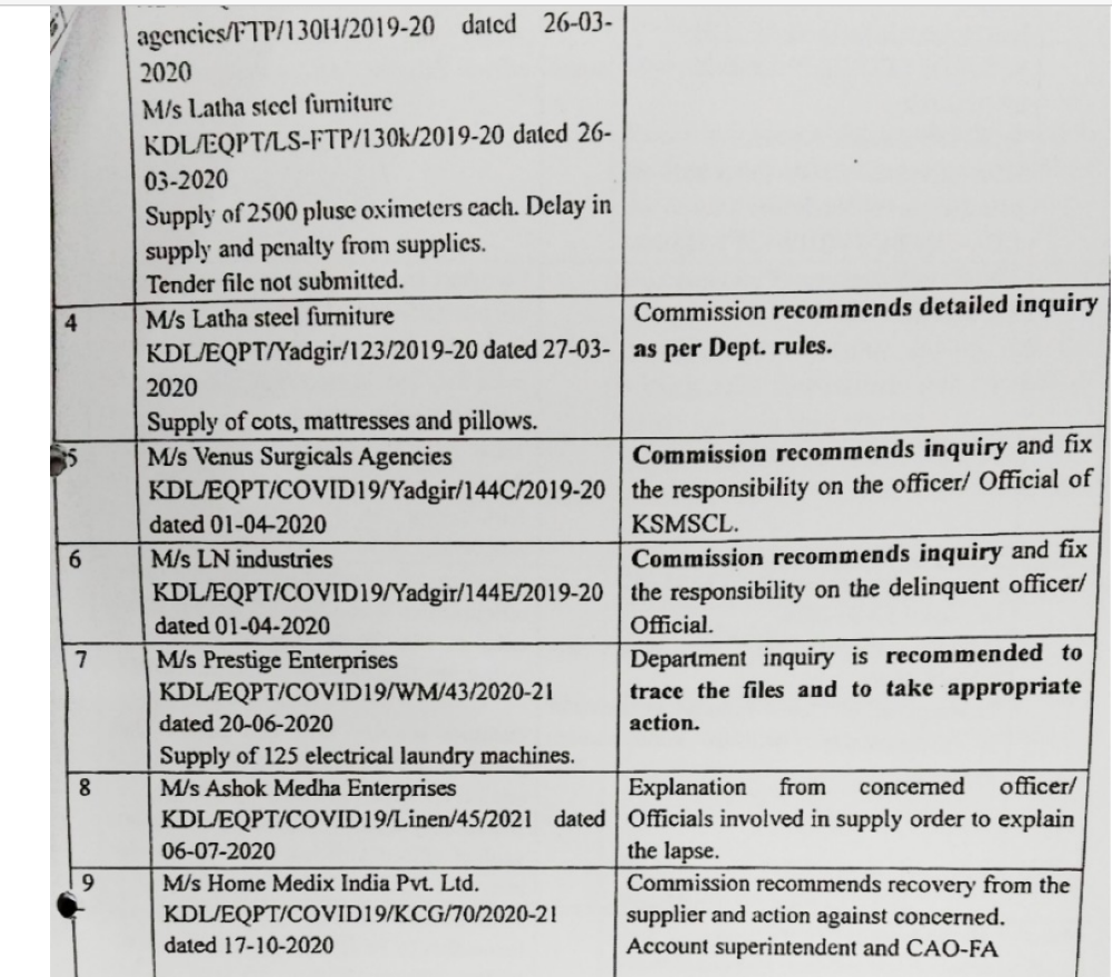 ಇದೀಗ ಕುನ್ಹಾ ಅವರು ನೀಡಿರುವ ವರದಿಯಲ್ಲಿ ಲತಾ ಸ್ಟೀಲ್ ಫರ್ನಿಚರ್ ಕಂಪನಿ ಮತ್ತು ಈ ಕಂಪನಿಯಿಂದ ಖರೀದಿಸಿರುವ ಪಲ್ಸ್ ಆಕ್ಸಿಮೀಟರ್ ಉಪಕರಣದ ಖರೀದಿಯಲ್ಲಿನ ಅಕ್ರಮದ ವಿವರಗಳನ್ನು ಉಲ್ಲೇಖಿಸಿದೆ.