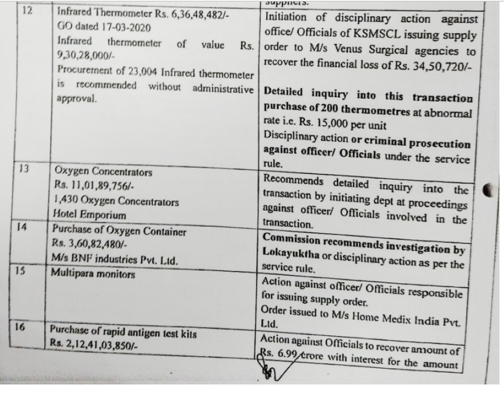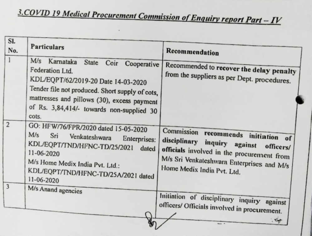 ಕುನ್ಹಾ ಅವರ ಅವರ ವರದಿಯಲ್ಲಿ ಆಕ್ಸಿಜನ್ ಉಪಕರಣ ಖರೀದಿ ಕುರಿತು ಮತ್ತು ವೆಂಕಟೇಶ್ವರ ಎಂಟರ್ ಪ್ರೈಸೆಸ್ ಮತ್ತು ಹೋಮೆಡಿಕ್ಸ್ ಕಂಪನಿ ಕುರಿತು ಪ್ರಸ್ತಾಪ ಮಾಡಿದೆ.