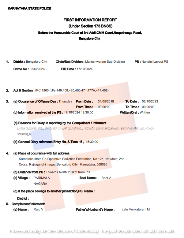 ಮಂಡಳಿಯ ಅಧ್ಯಕ್ಷ ರಾಜು ಅವರು ಸಲ್ಲಿಸಿದ್ದ ದೂರರ್ಜಿಗೆ ಸಂಬಂಧಿಸಿದಂತೆ ಮಂಡಳಿಯ ಹಿಂದಿನ ಸಿಇಒ ಆಶಾಲತಾ ಸೇರಿದಂತೆ ಒಟ್ಟು 6 ಮಂದಿ ವಿರುದ್ಧ ನಂದಿನಿ ಪೊಲೀಸ್ ಠಾಣೆಯಲ್ಲಿ ಎಫ್ಐಆರ್ ದಾಖಲಾಗಿದೆ.