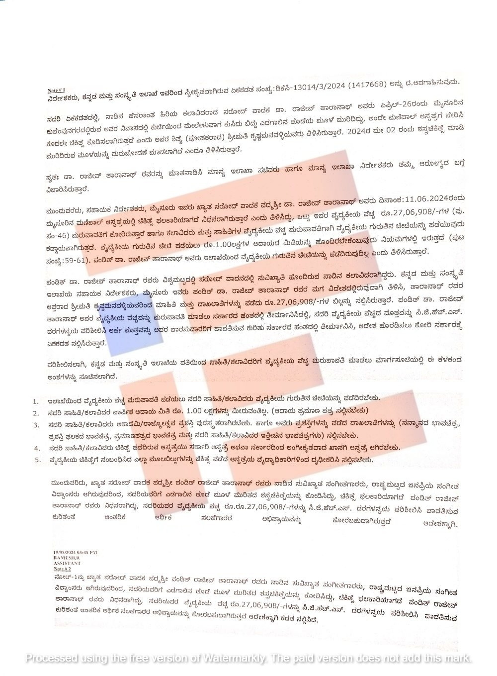 ರಾಜೀವ್ ತಾರಾನಾಥ್ ಅವರ ವೈದ್ಯಕೀಯ ಚಿಕಿತ್ಸೆ ವೆಚ್ಚಕ್ಕೆ ಸಂಬಂಧಿಸಿದಂತೆ ಕನ್ನಡ ಮತ್ತು ಸಂಸ್ಕೃತಿ ಇಲಾಖೆಯು (ಡಿಕೆಸಿ-13014/3/2024 (1417668) ಸಂಖ್ಯೆಯ ಜುಲೈ 2024ರಲ್ಲಿ ಏಕ ಕಡತ ತೆರೆದಿತ್ತು. ಆದರೆ ಇದುವರೆಗೂ ಕಡತಕ್ಕೆ ಮುಕ್ತಿ ಸಿಕ್ಕಿಲ್ಲ.